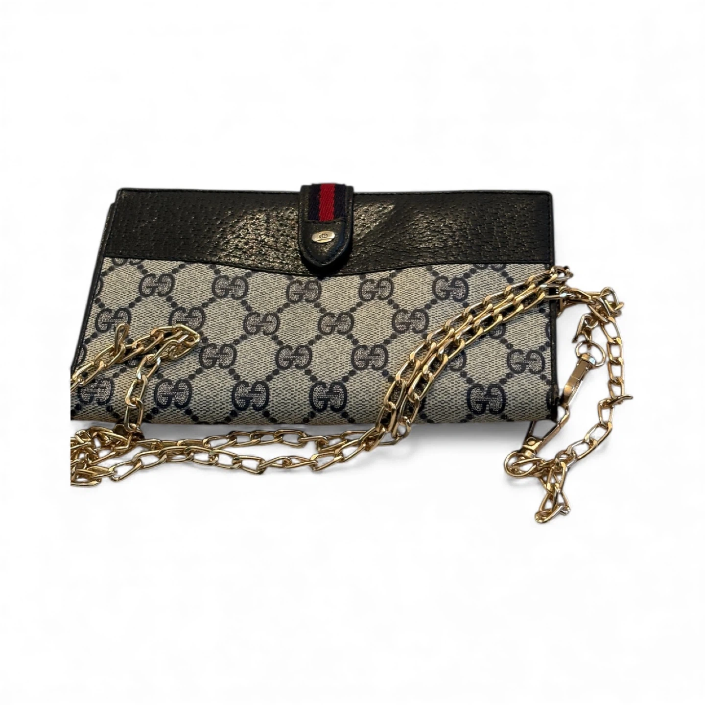 Selling a Gucci Luxury Collection wallet with a chain strap. It features the classic Gucci GG pattern. A stylish and functional accessory!