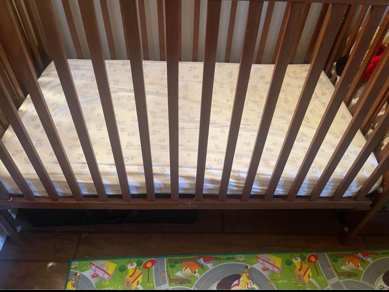 In very good condition Brown Storkcraft Hillcrest Crib can be adjusted. Comes with mattress Barely used. Must pick up Westend from smoke free bugs free home