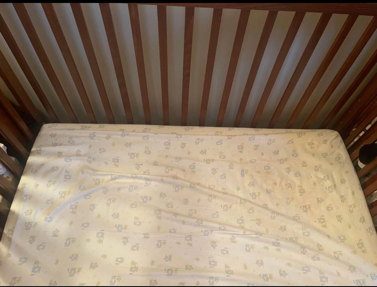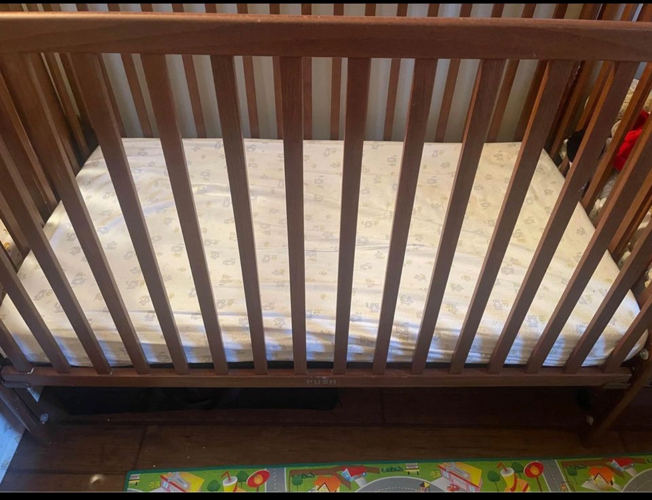 In very good condition Brown Storkcraft Hillcrest Crib can be adjusted. Comes with mattress Barely used. Must pick up Westend from smoke free bugs free home