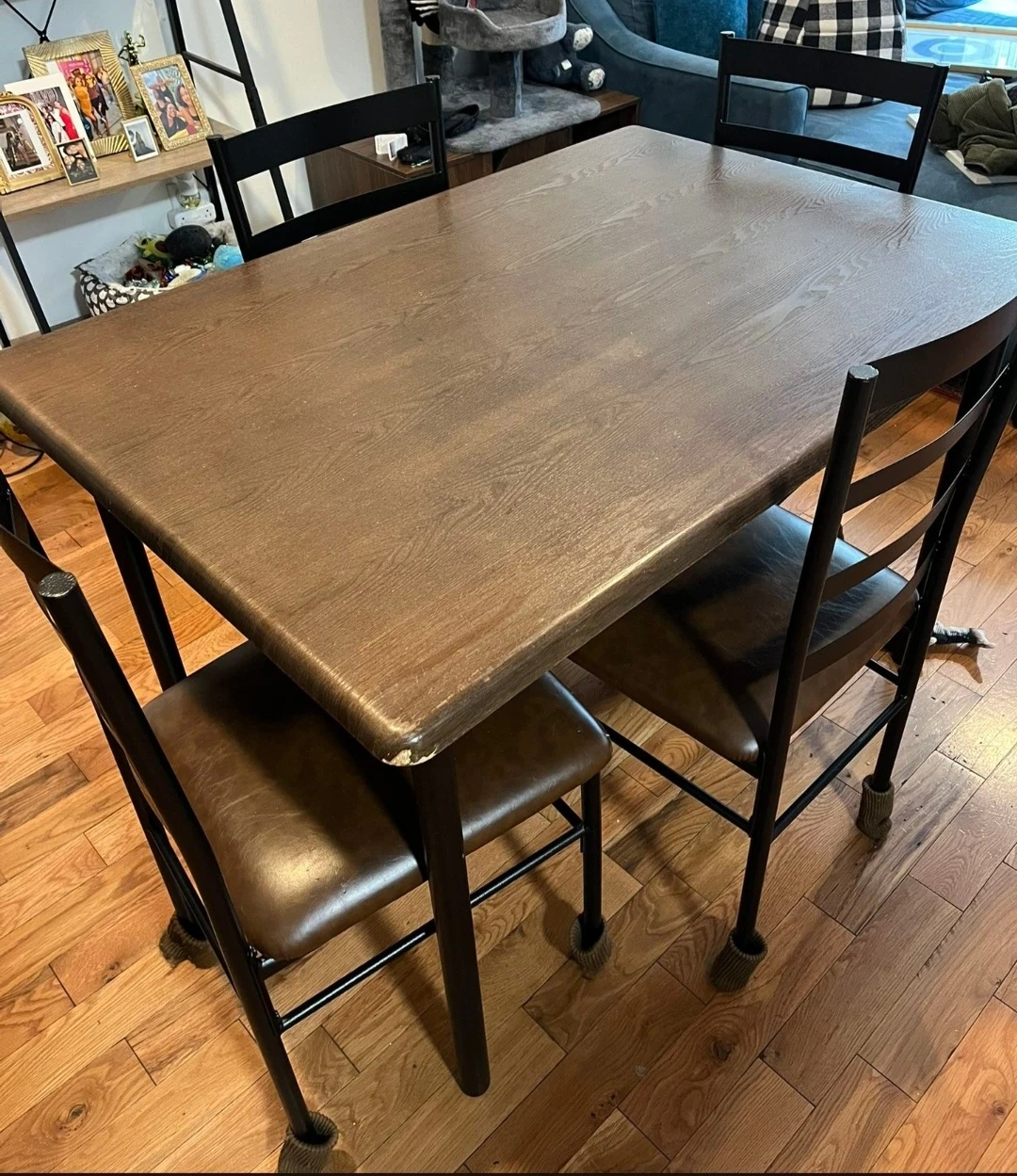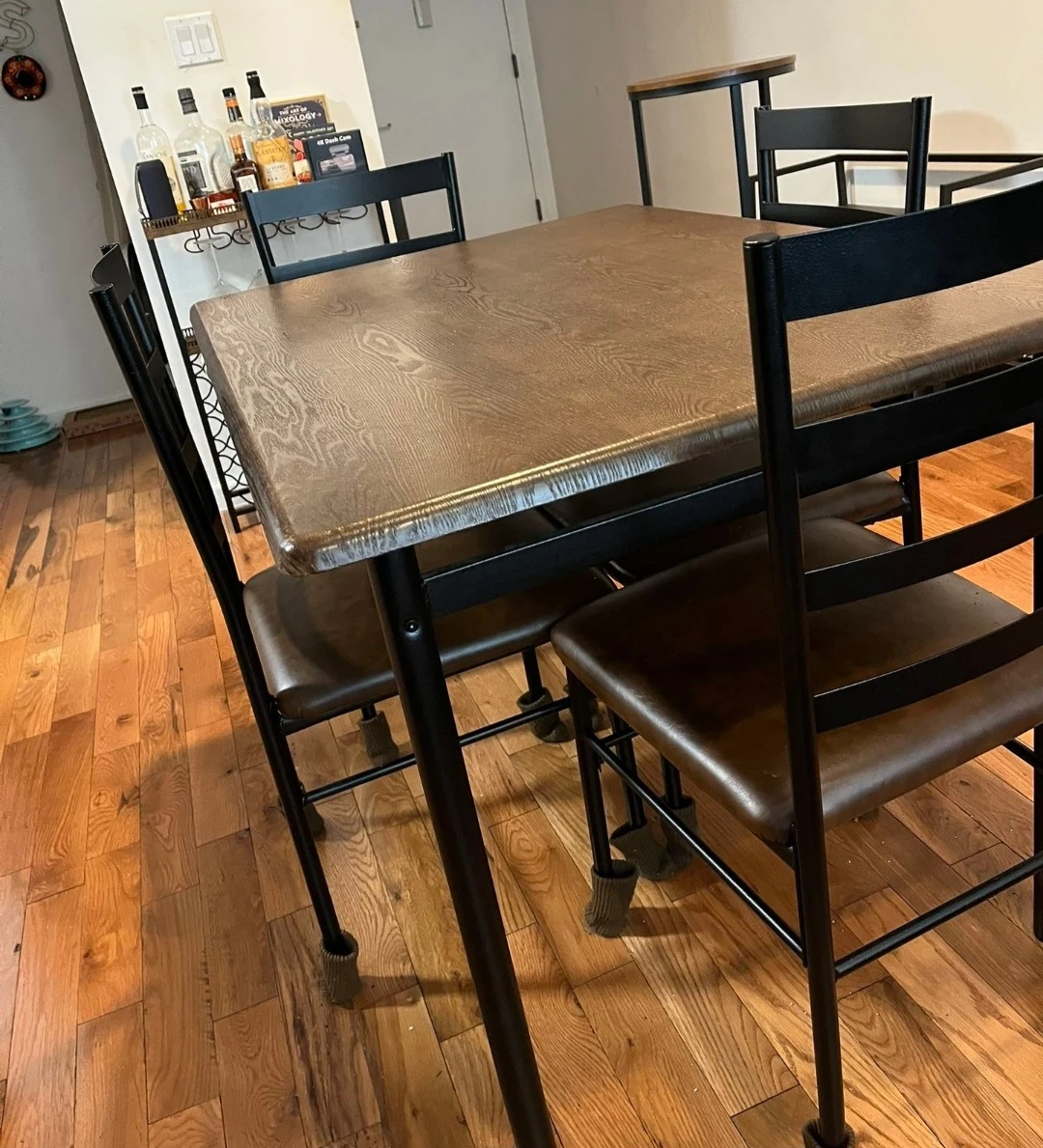 This dining set features a faux wood laminate top and comfortable vinyl seats. The chairs have metal frames and are on casters for easy movement. It's a functional set for a smaller dining space. Includes 4 chairs.
