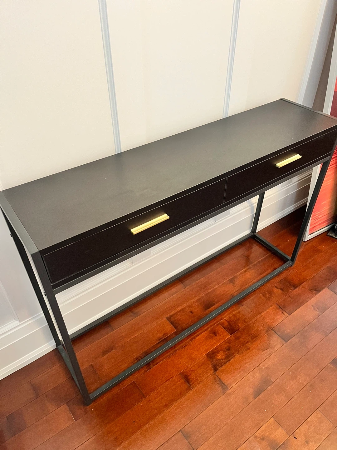 A sleek black console table featuring two drawers with gold handles. Its slim metal frame provides a modern look. This table's drawers offer convenient storage for essentials.