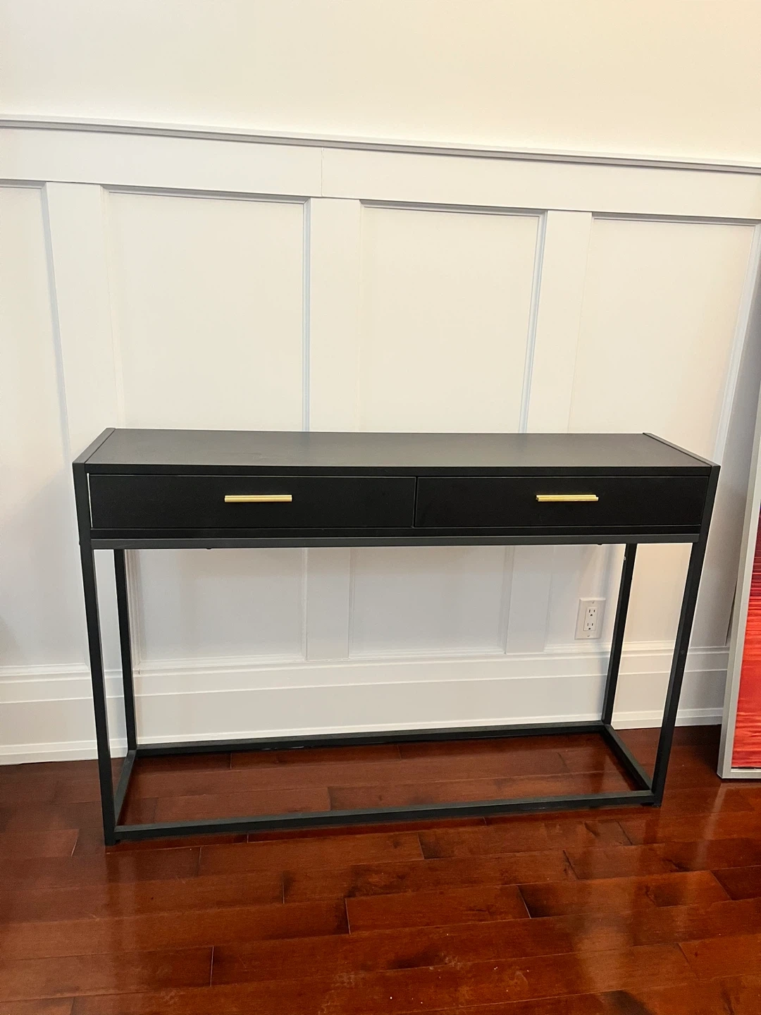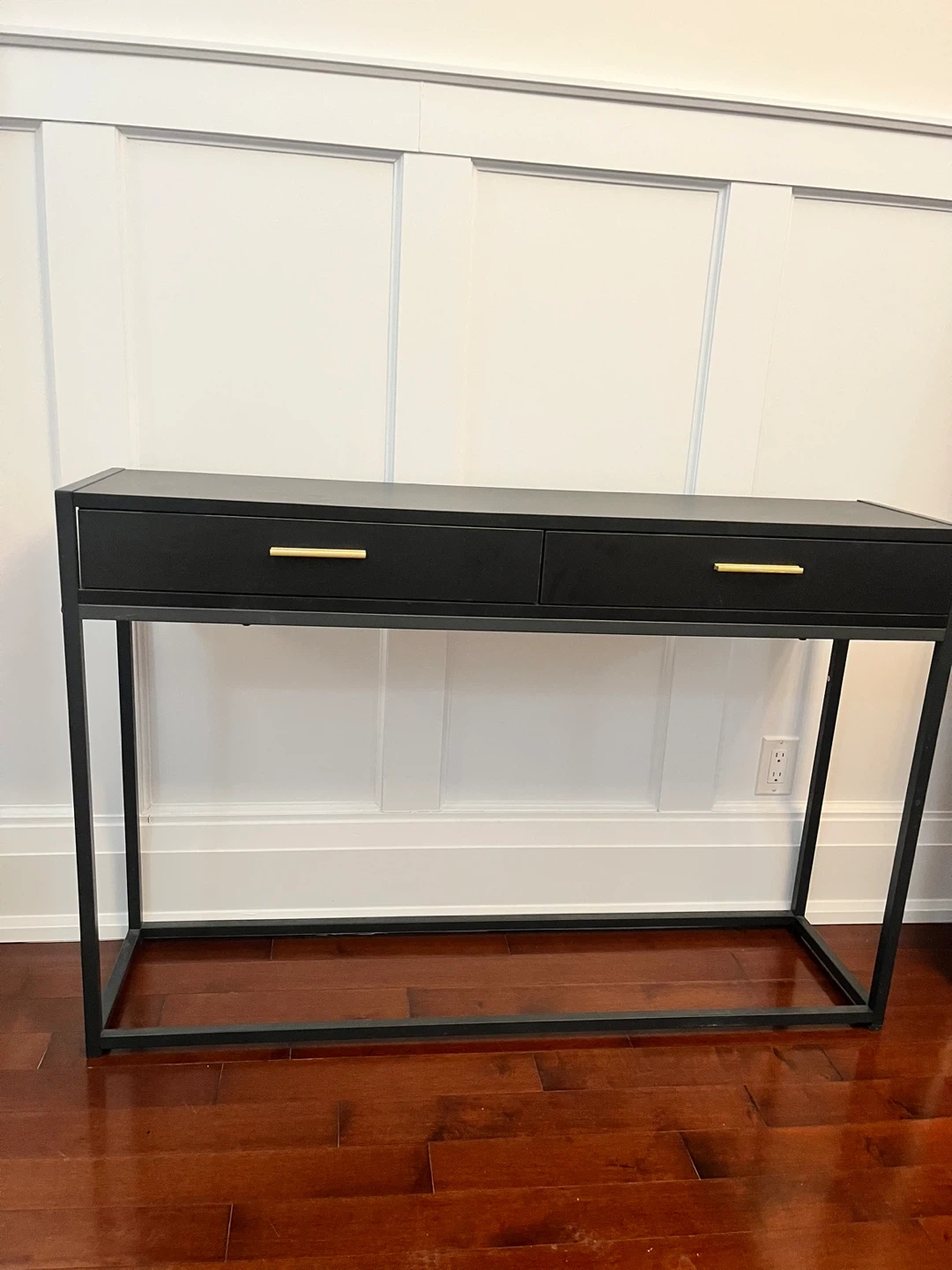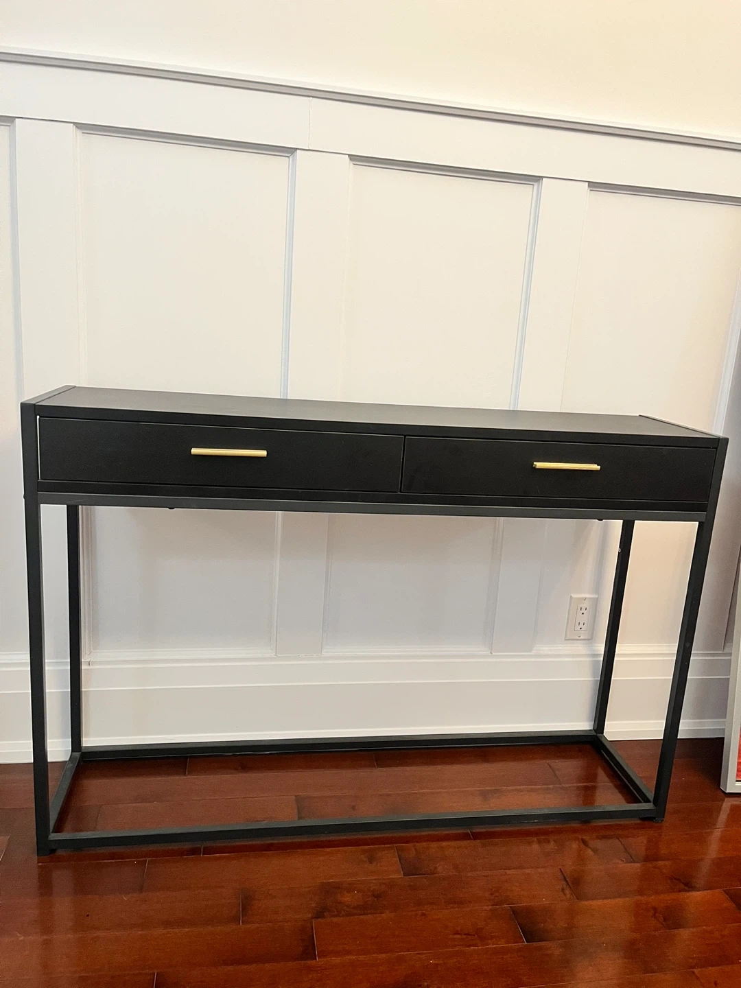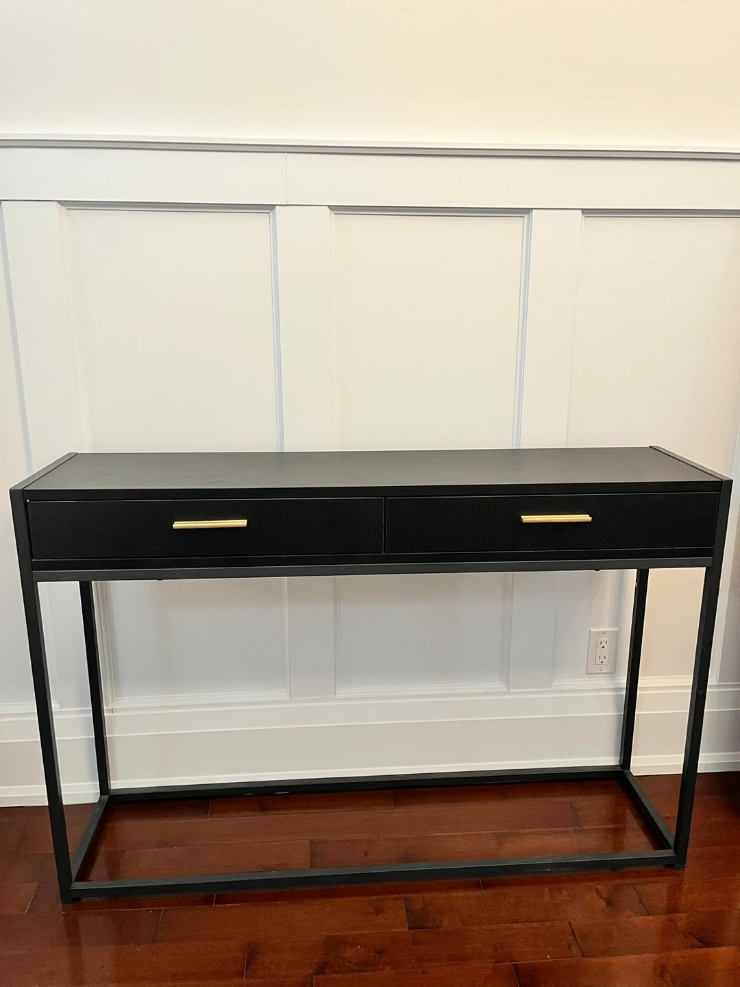 A sleek black console table featuring two drawers with gold handles. Its slim metal frame provides a modern look. This table's drawers offer convenient storage for essentials.