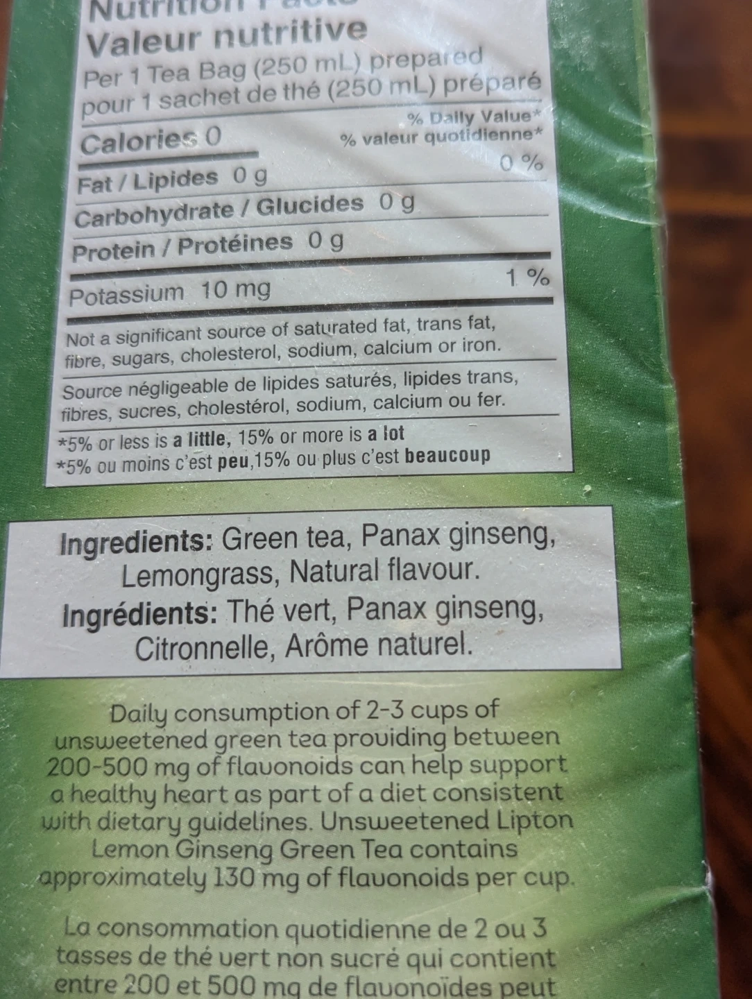 This box contains Lipton Green Tea with Lemon Ginseng and Natural Flavour. Ingredients include green tea, Panax ginseng, lemongrass, and natural flavour. Daily consumption of 2-3 cups can help support a healthy heart.