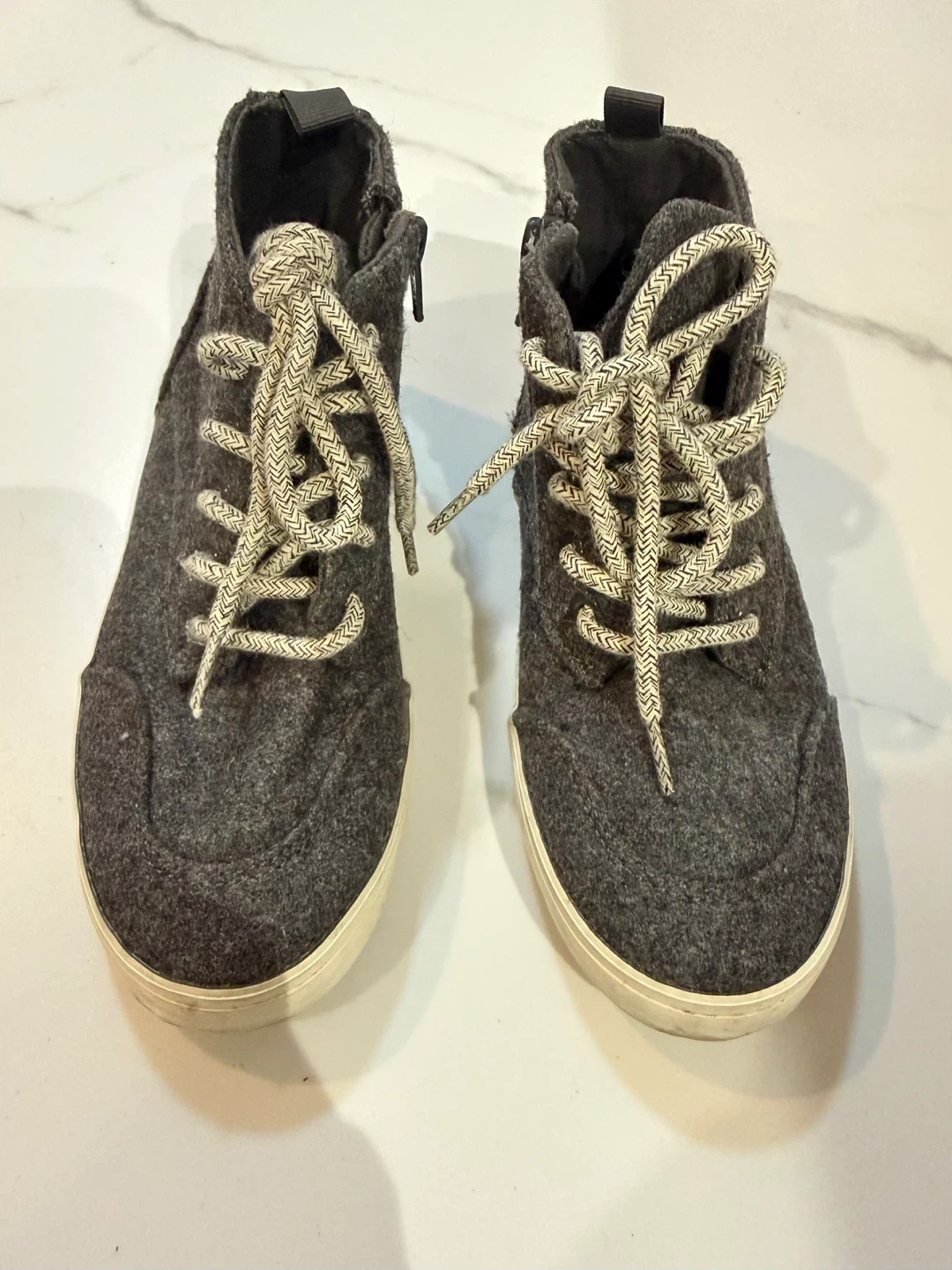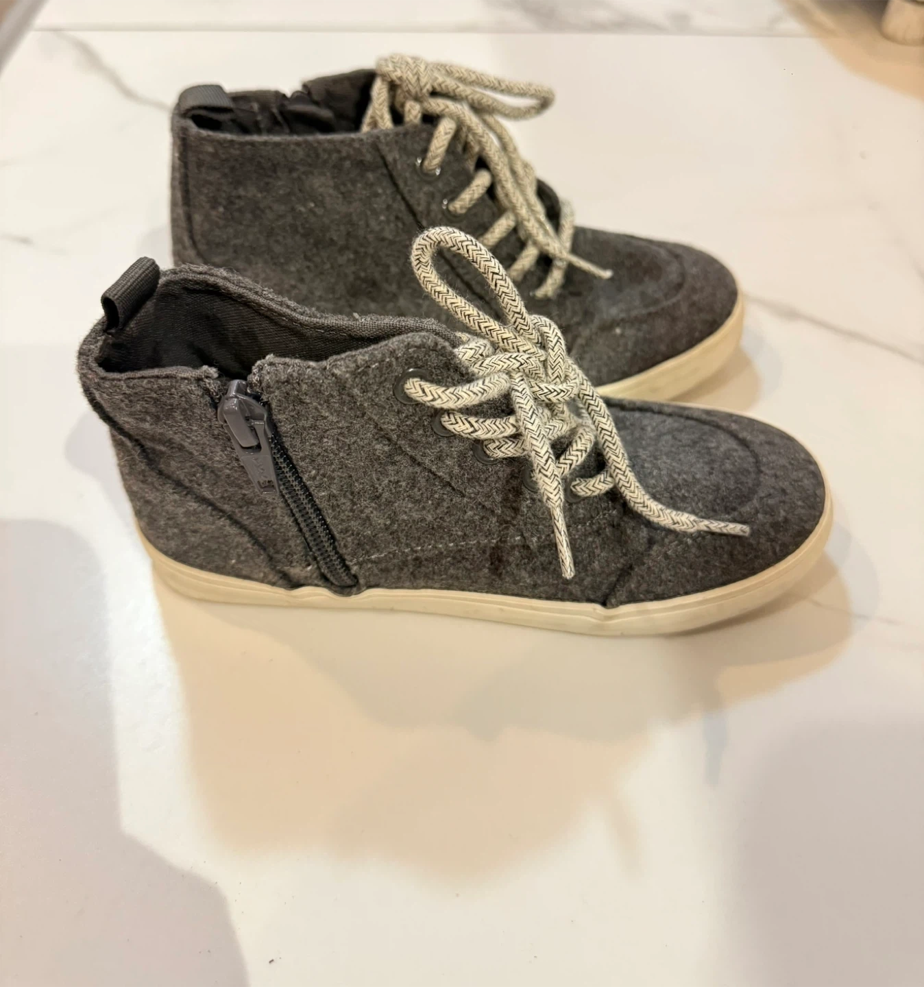 Grey fleece high-top sneakers with laces and a zipper on the side. These shoes are made for comfort and style. The sole is rubber. No wear or tear. From Old Navy.