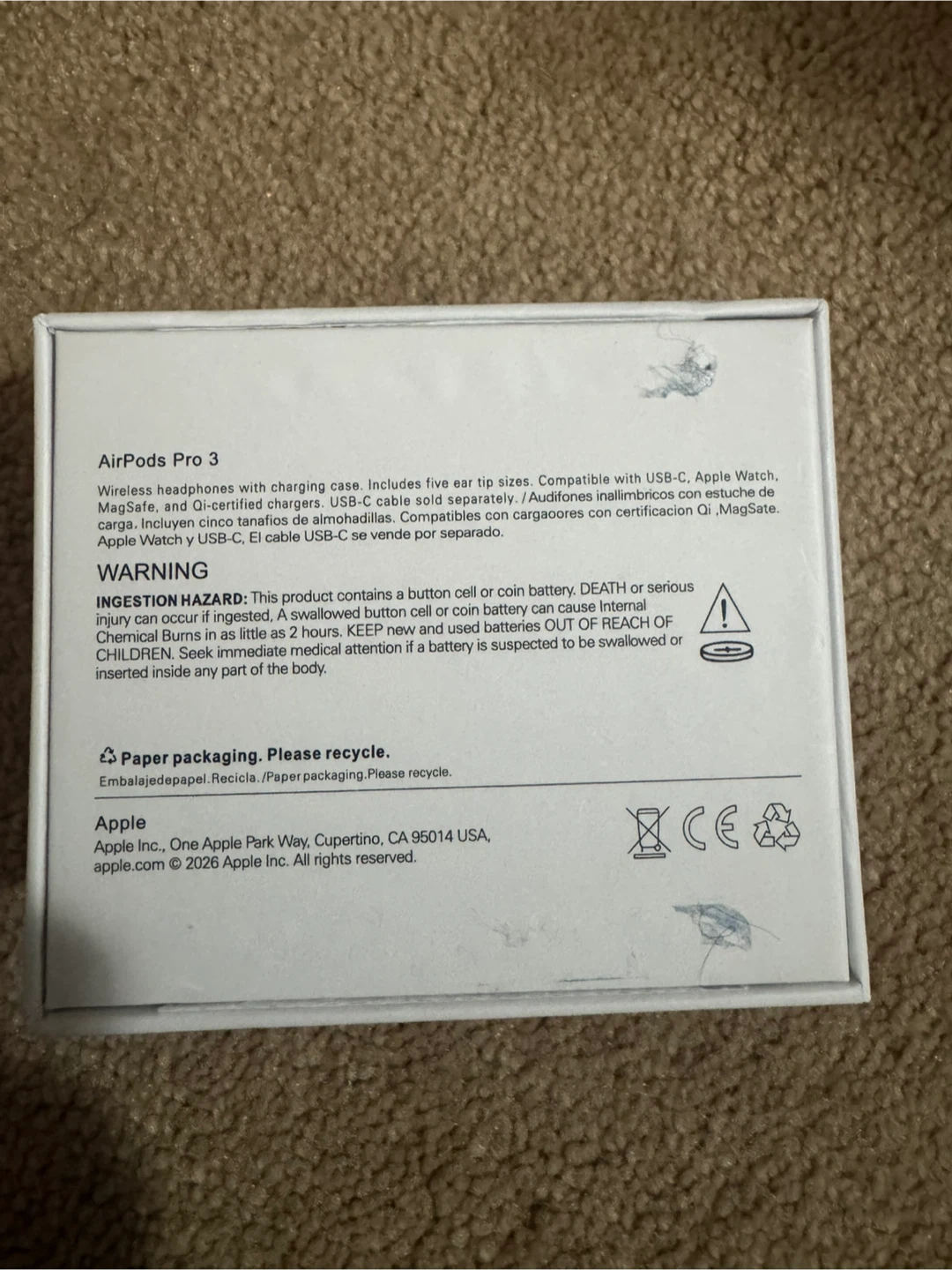 Wireless headphones with charging case. Includes five ear tip sizes. Compatible with USB-C, Apple Watch, MagSafe, and Qi certified chargers. USB-C cable sold separately. Designed by Apple in California. Product of Vietnam.