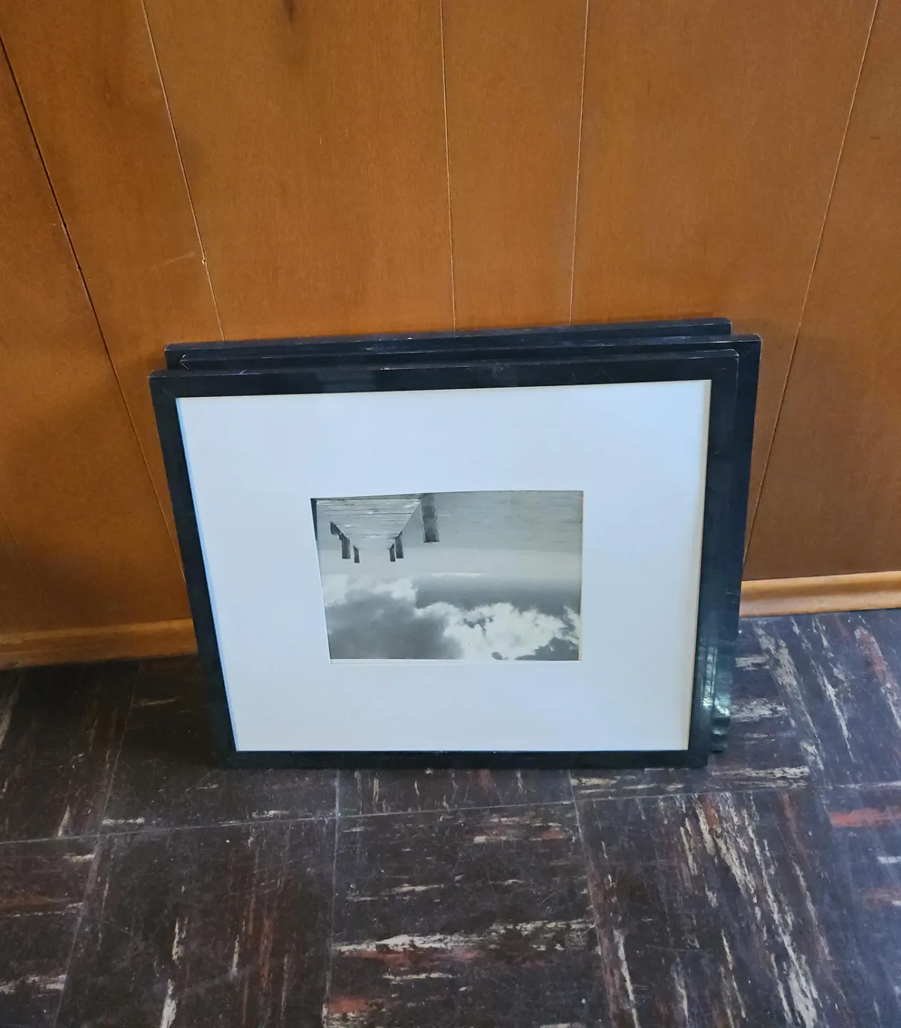 This is a black and white photograph featuring a surreal sky and architectural elements. It's housed in a simple black frame with a white mat. The print itself appears to be a fine art piece. Perfect for adding a touch of abstract art to any room!