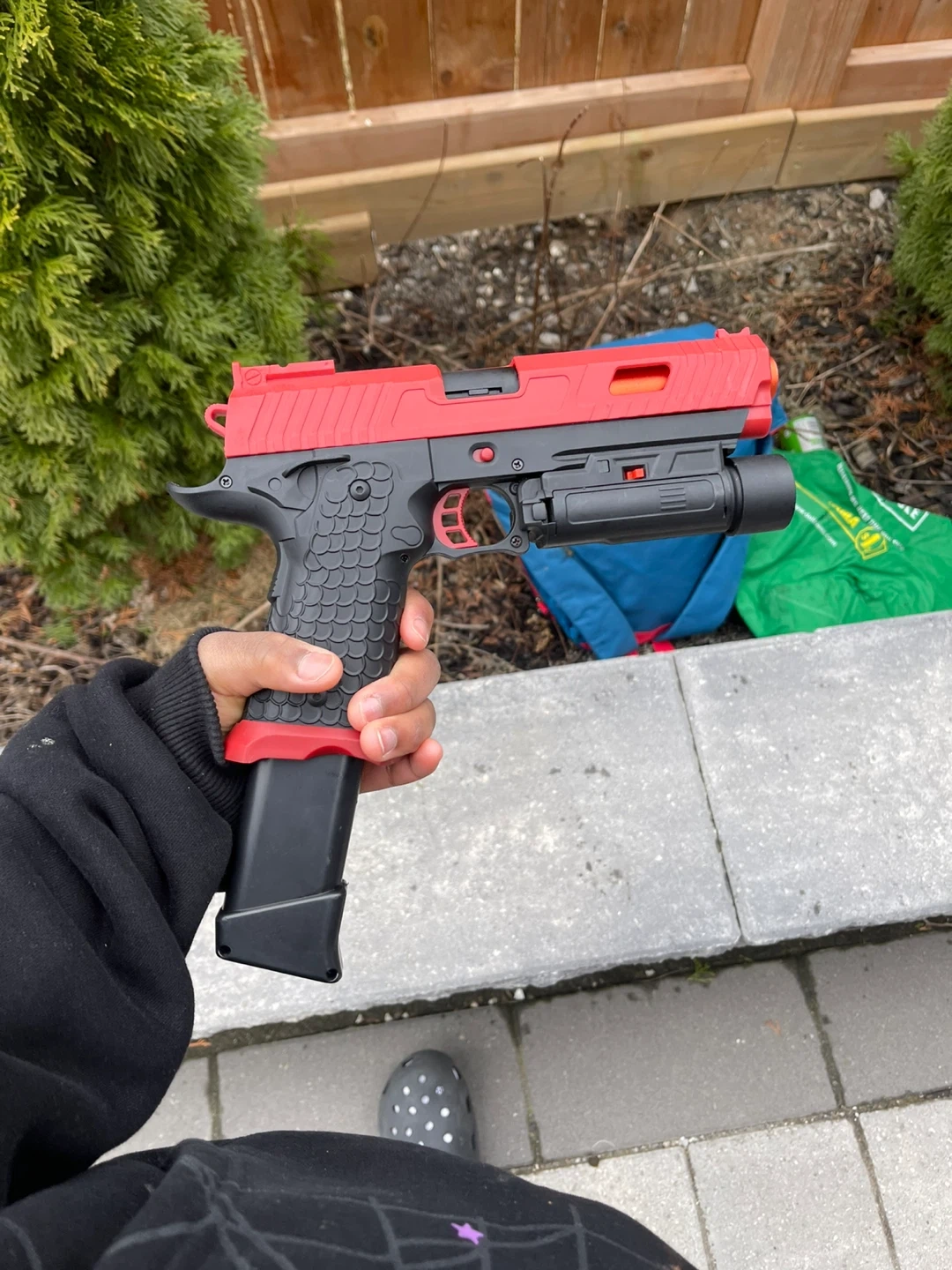 This is a red and black toy handgun. It comes with a detachable magazine and a light accessory attached to the front. It's a fun toy for imaginative play!