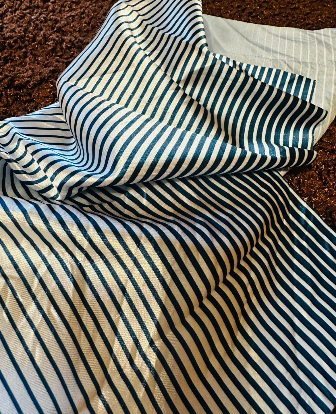 Set includes a satin scrunchie and a matching bandana. Both items feature a blue and white stripe pattern.