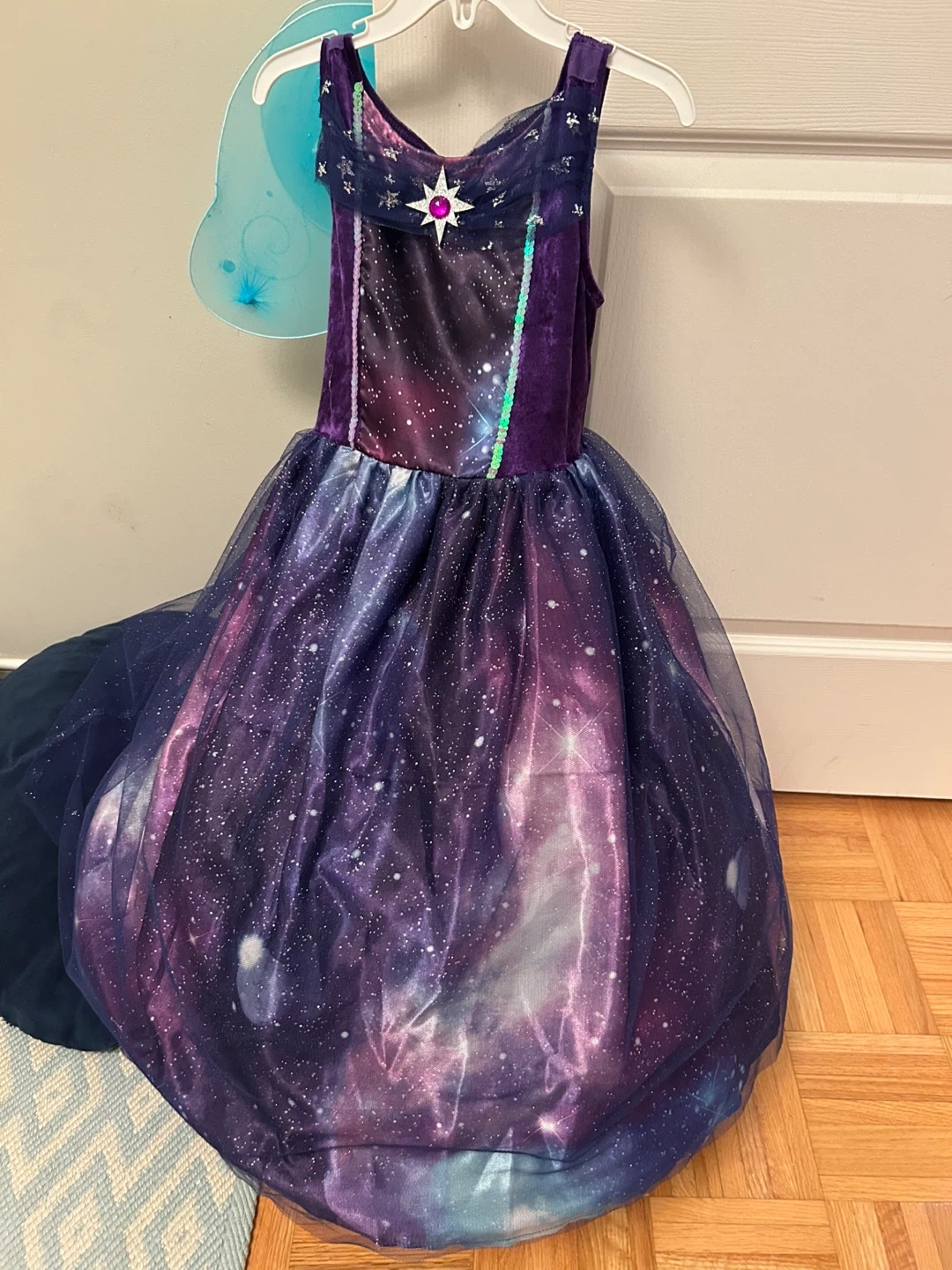 A sparkly galaxy-themed dress with attached fairy wings. It features a velvet bodice with a star gem and iridescent sequins. The full skirt has a starry night print with layers of tulle.