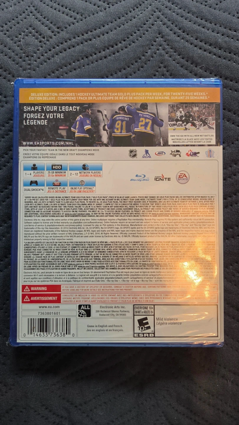 This is the NHL 17 Deluxe Edition for PlayStation 4. It includes the base game and bonus content. It's rated E10+ by the ESRB for Everyone 10 and older. This game is for hockey fans!