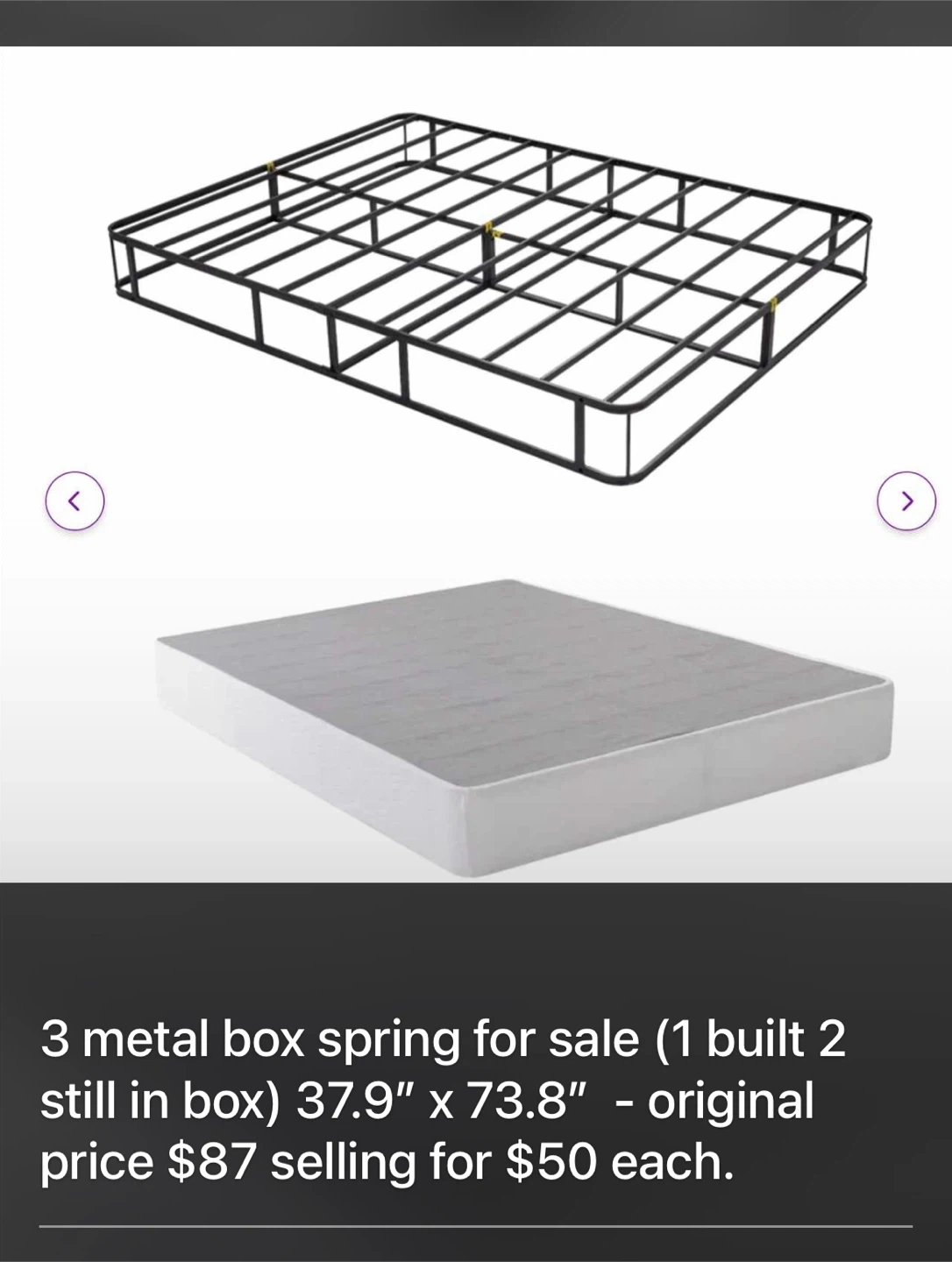 Buy & SellMetal Box Spring 37.9" x 73.8"Metal Box Spring 37.9" x 73.8"$40Selling a metal box spring that measures 37.9" x 73.8". One is built, Originally priced at $87ConditionNewWHERE TO MEETMeView MapSELLERLouiseMadison241 review2 chats·1 favorites·36 viewsSEND CHAT TO SELLERHi Louise! I’m interested in your listing.Hi Louise! I’m interested in your listing.Get the Karrot app to chatSign In to chat