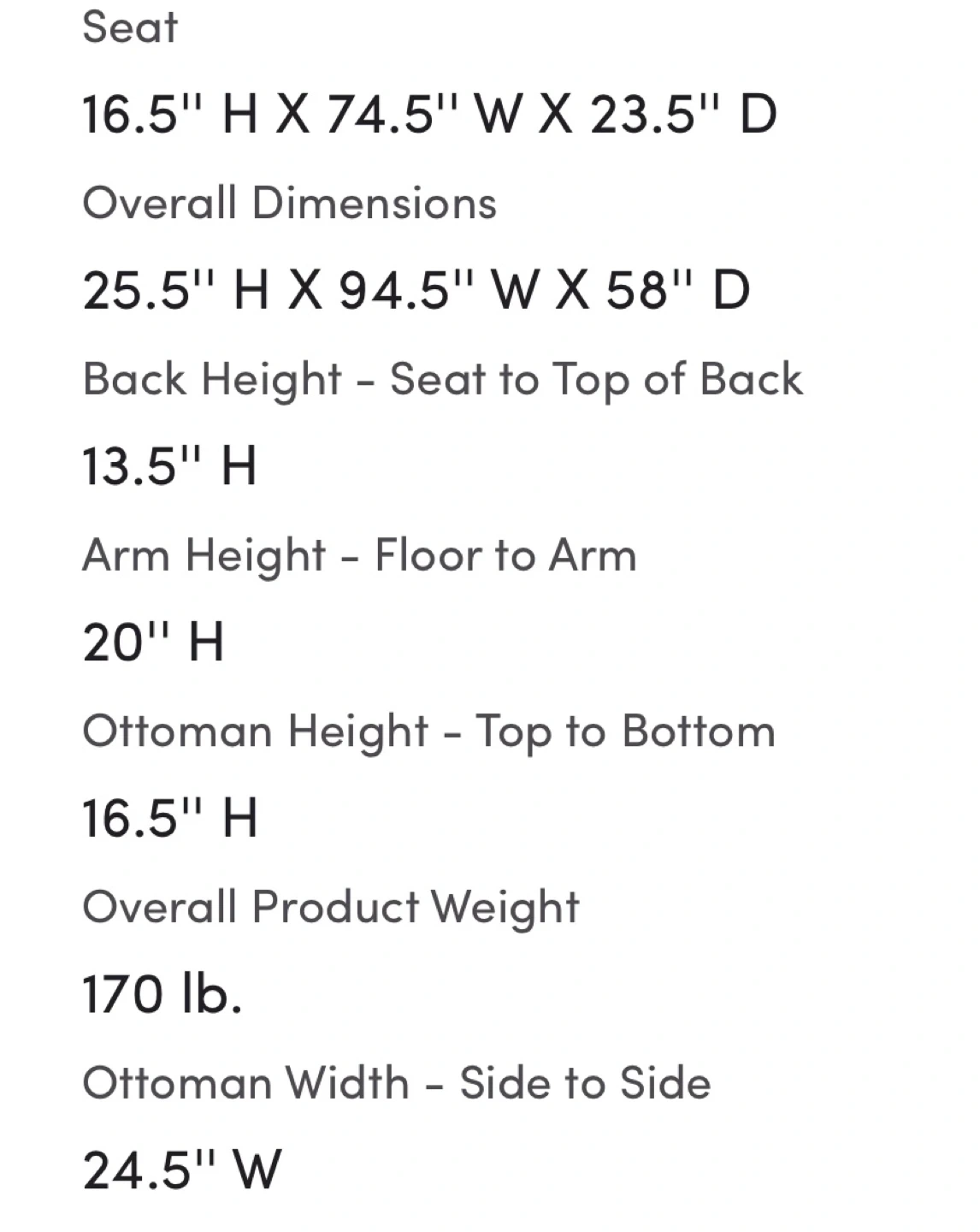 The seat dimensions are 16.5" H x 74.5" W x 23.5" D, and the overall dimensions are 25.5" H x 94.5" W x 58" D. The ottoman is 16.5" H with a width of 24.5". It's a great addition to any living room!