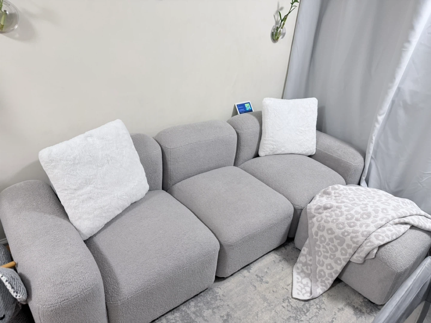 Selling a comfy cloud modular sofa with an ottoman! The sofa is a light gray color and has a soft, textured, teddy bear material.