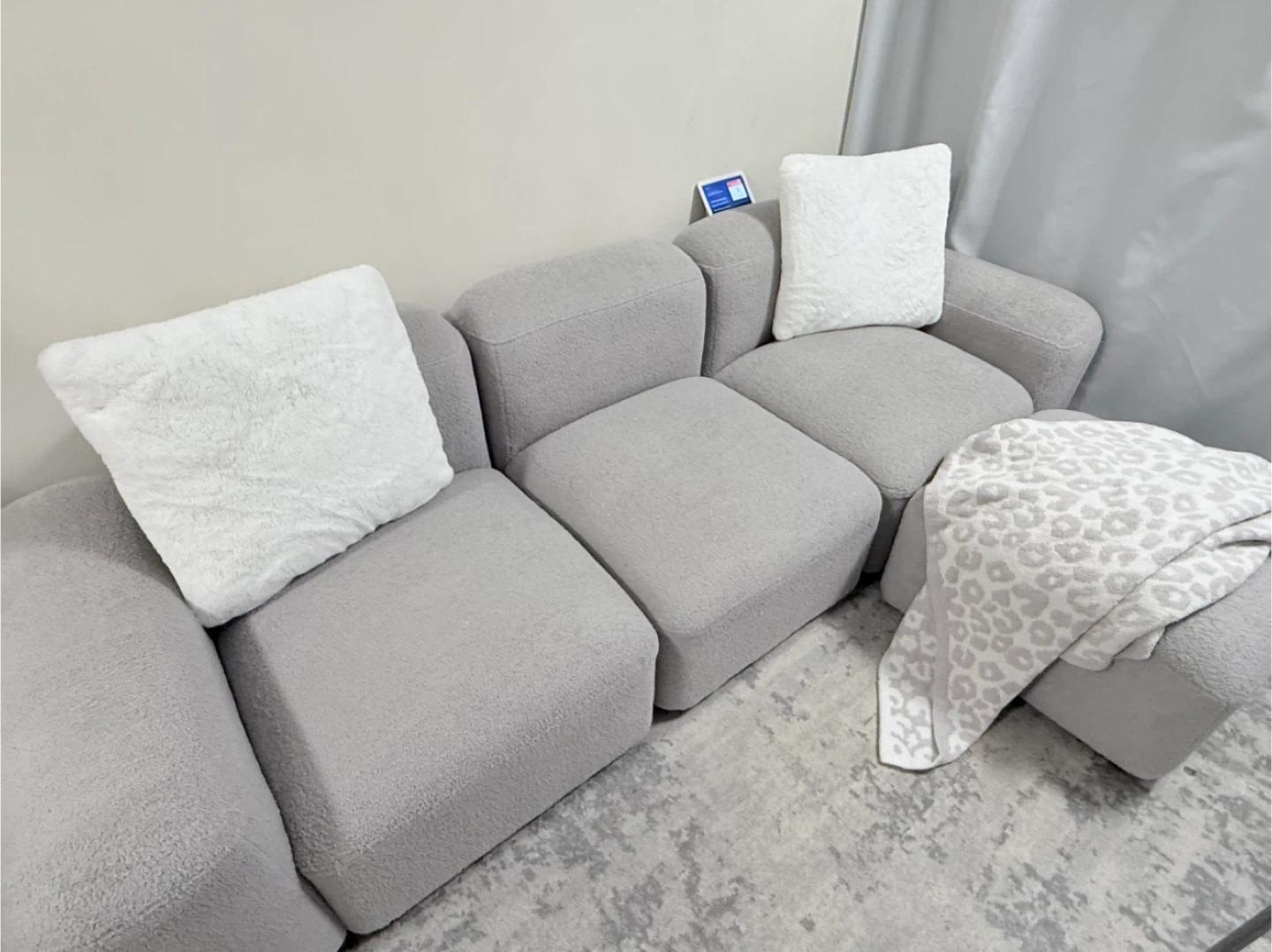 Selling a comfy cloud modular sofa with an ottoman! The sofa is a light gray color and has a soft, textured, teddy bear material.