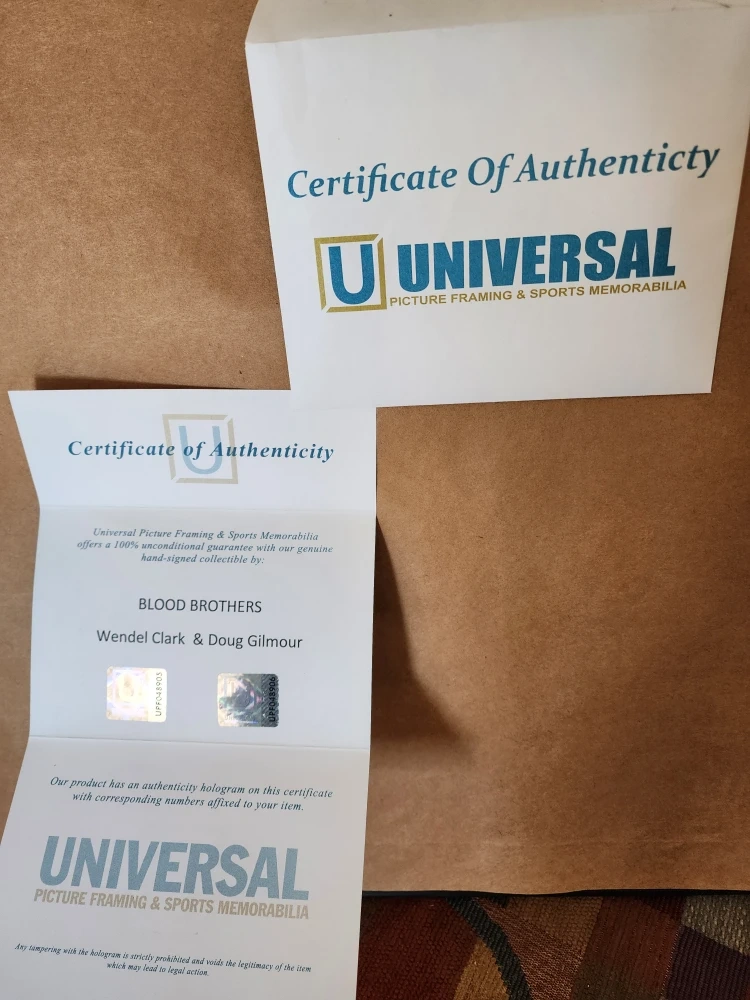 Selling a framed autograph of Wendel Clark and Doug Gilmour, titled "Blood Brothers". It includes a certificate of authenticity from Universal Picture Framing & Sports Memorabilia. A great piece for any Toronto Maple Leafs fan!
