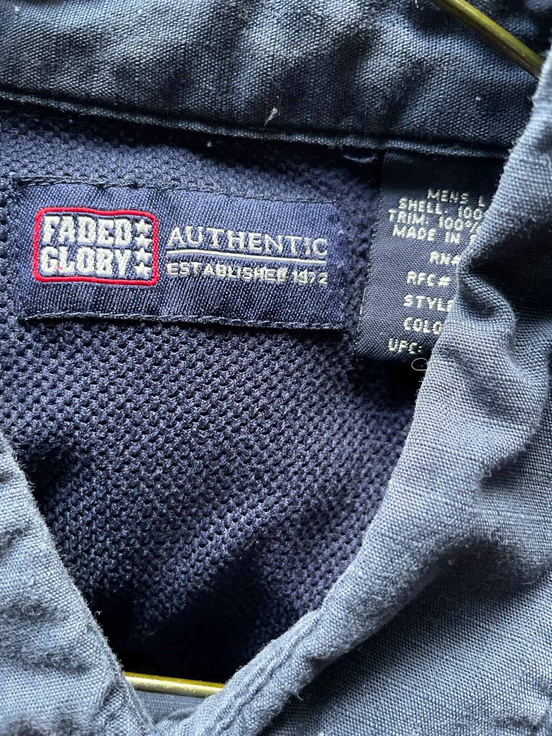 This is a men's short-sleeve button-up shirt from Faded Glory. It's a navy blue colour and made of 100% cotton. The shirt has two chest pockets and a collared neckline. Large
