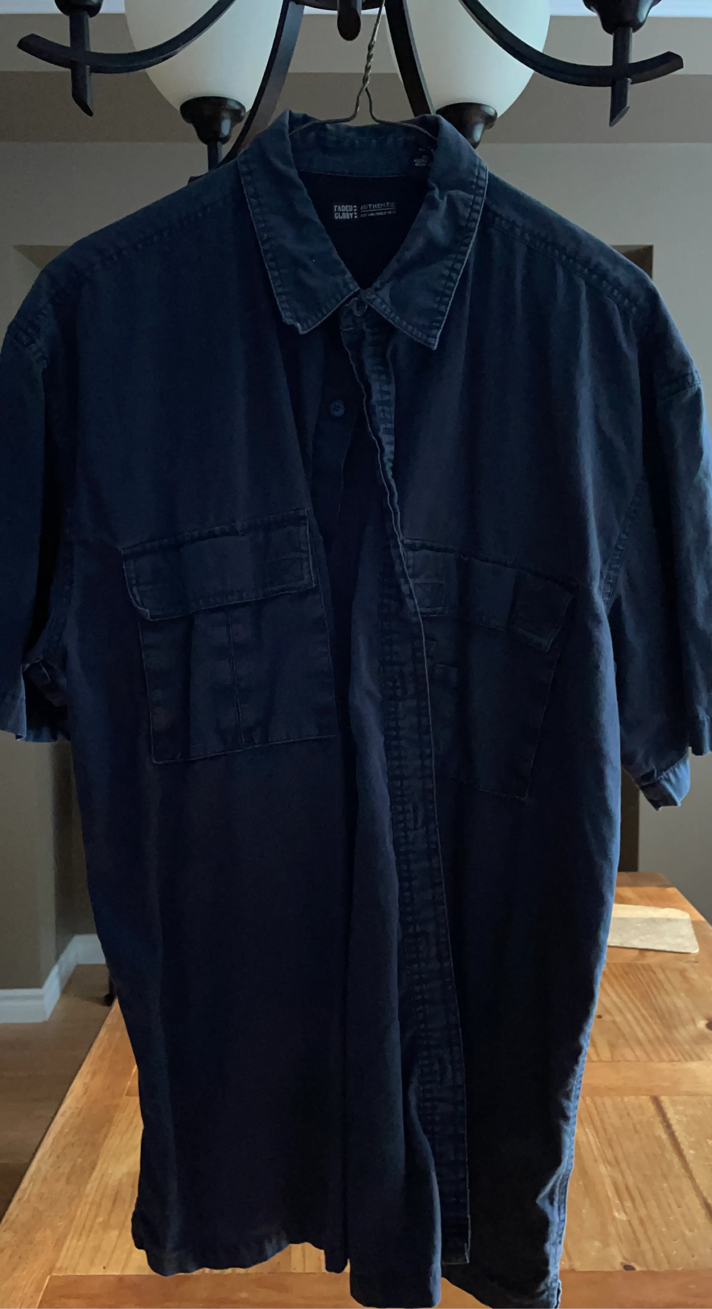 This is a men's short-sleeve button-up shirt from Faded Glory. It's a navy blue colour and made of 100% cotton. The shirt has two chest pockets and a collared neckline. Large