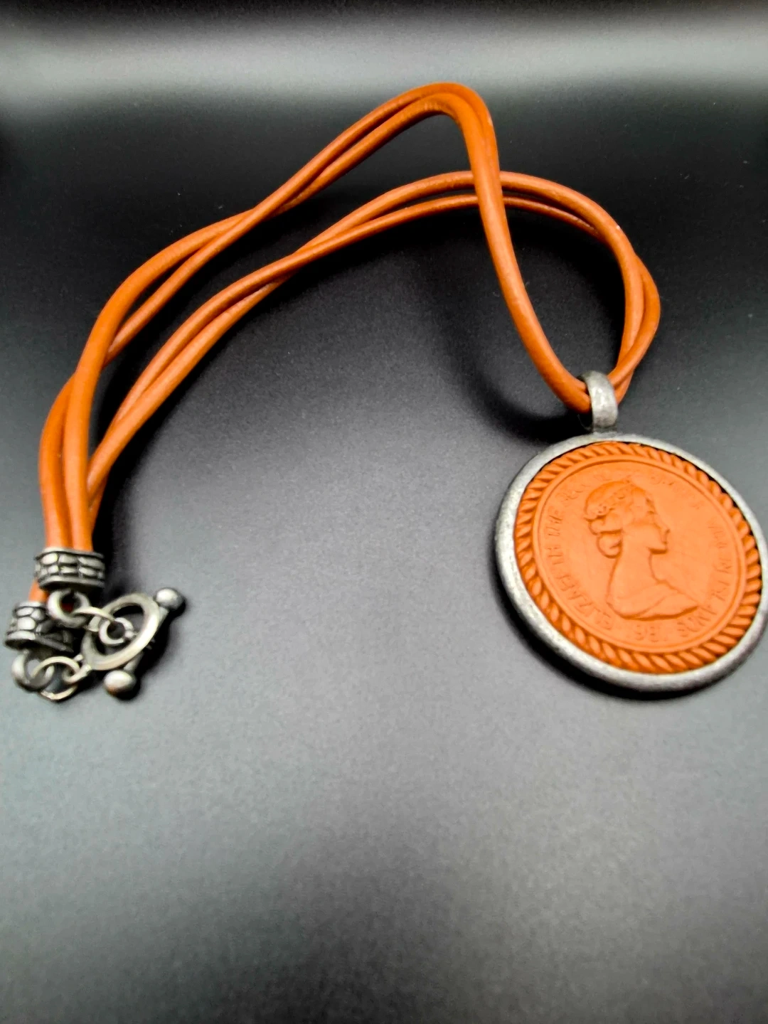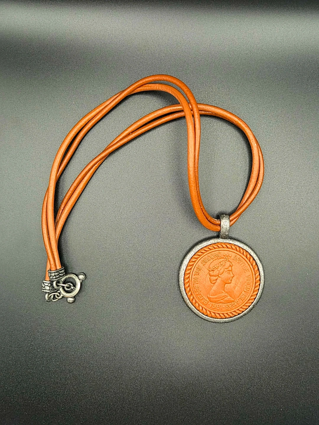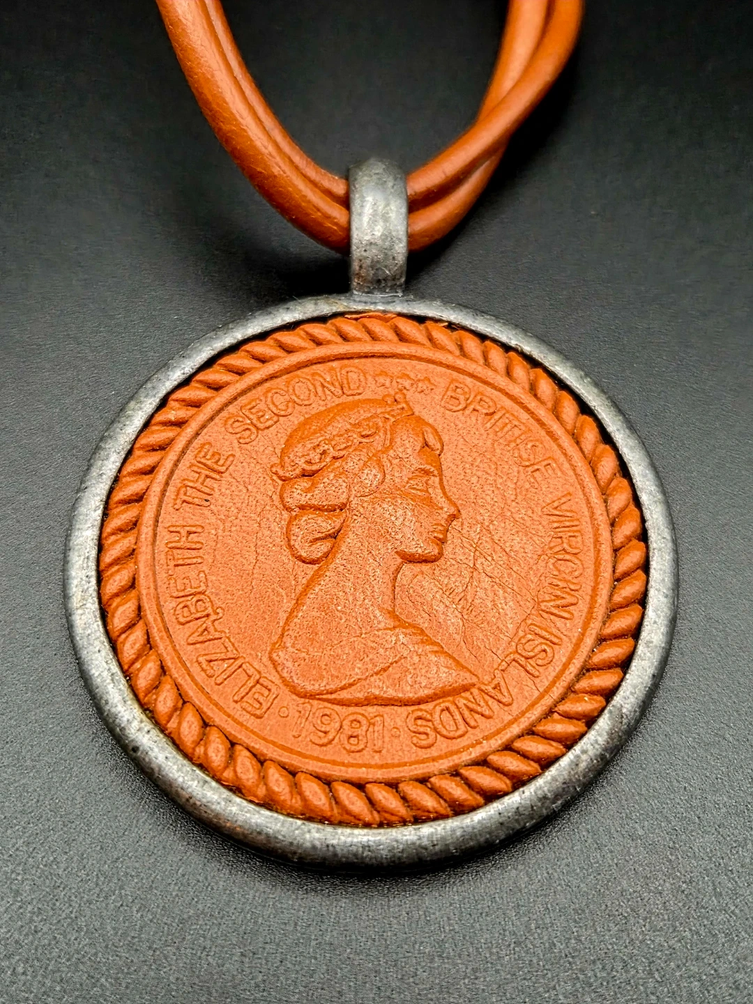 Features a pendant with Queen Elizabeth II and "British Virgin Islands 1981". It's strung on a double leather cord with a silver-tone clasp. Leather cord material.