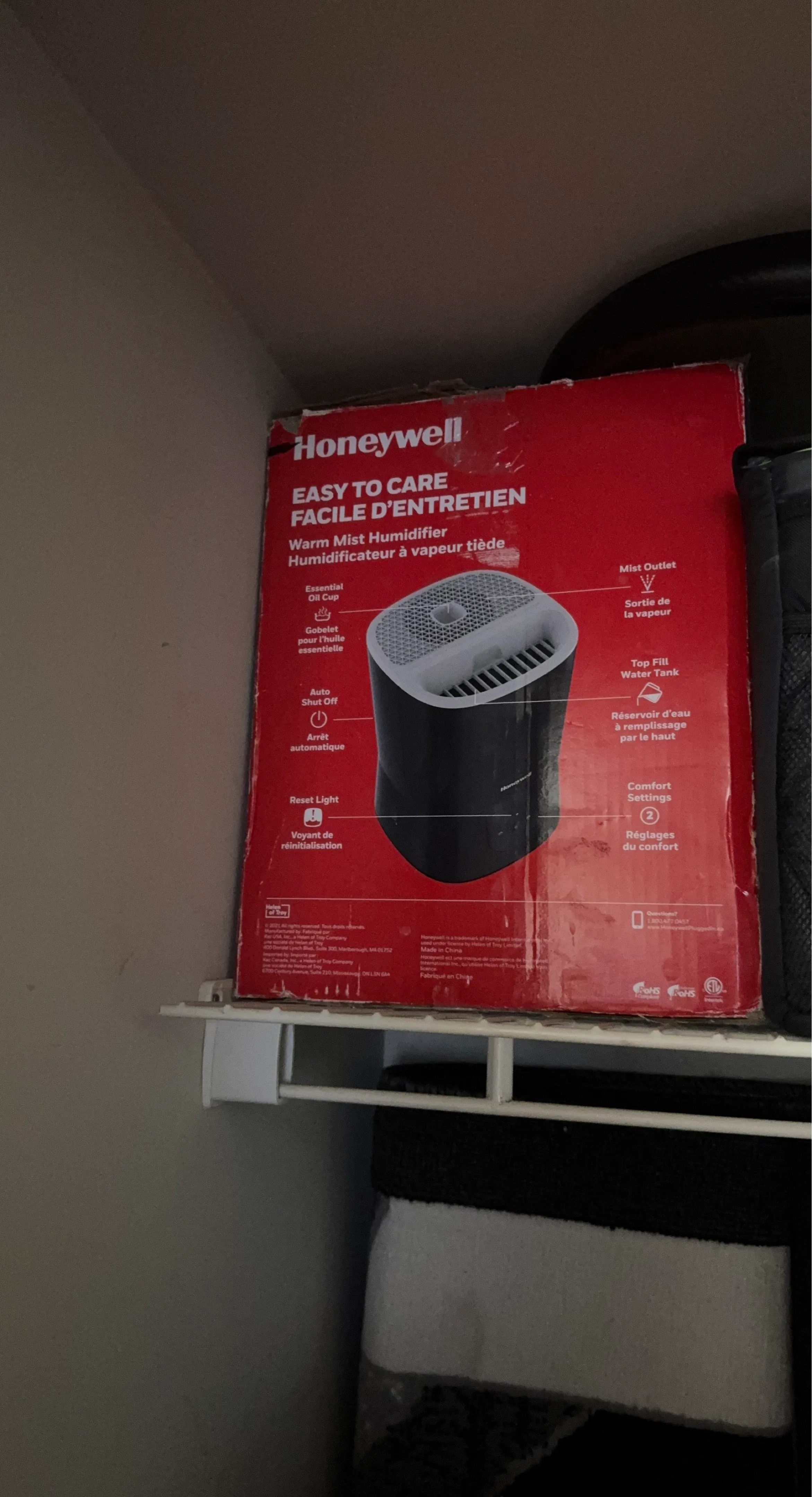 This is a Honeywell warm mist humidifier. It features an essential oil cup and an auto shut-off function. The top-fill water tank makes refilling easy.