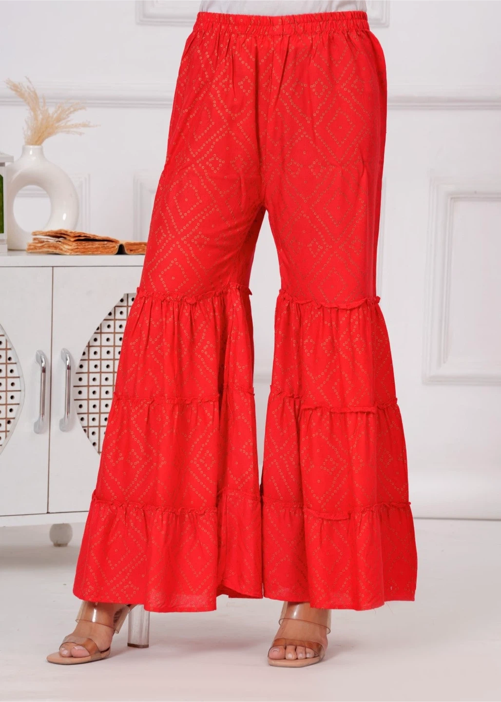 These stylish red palazzo pants feature a vibrant gold geometric print. They're designed with multiple tiered ruffles at the hem for a flowy look. The elastic waistband ensures a comfortable fit for all-day wear.