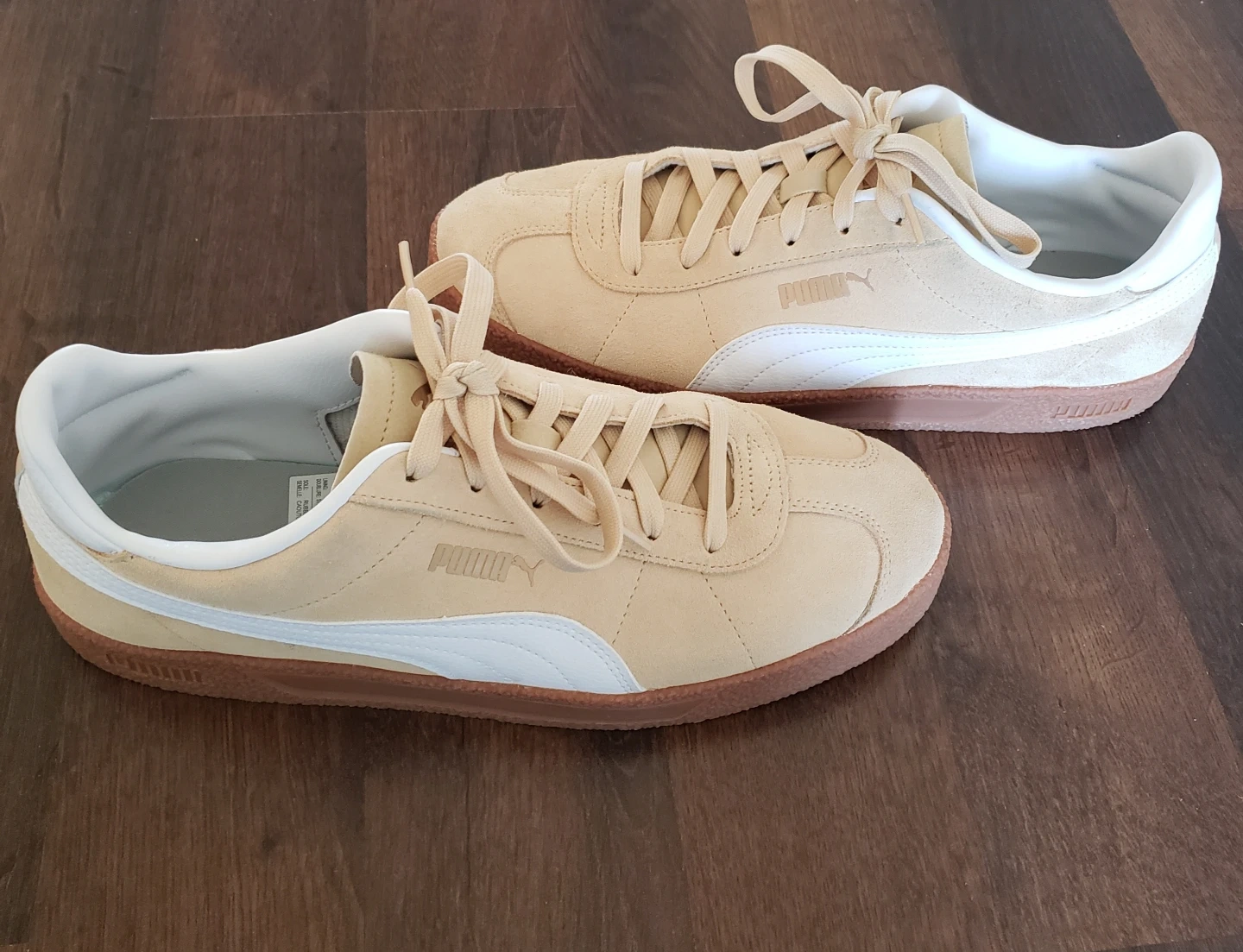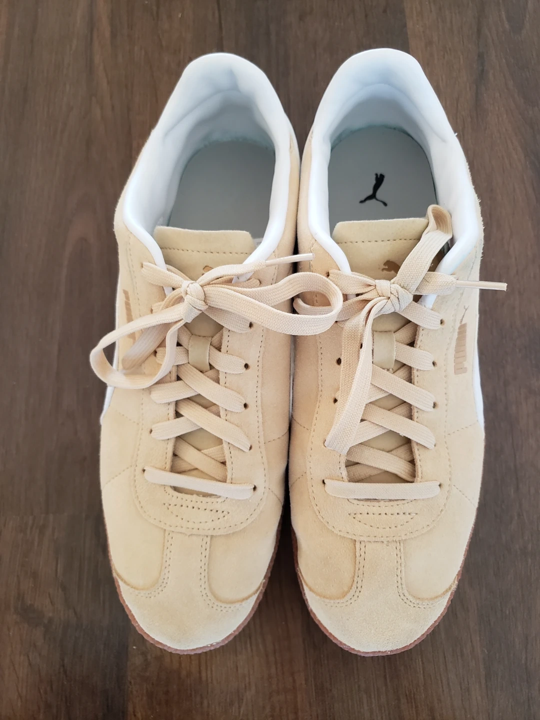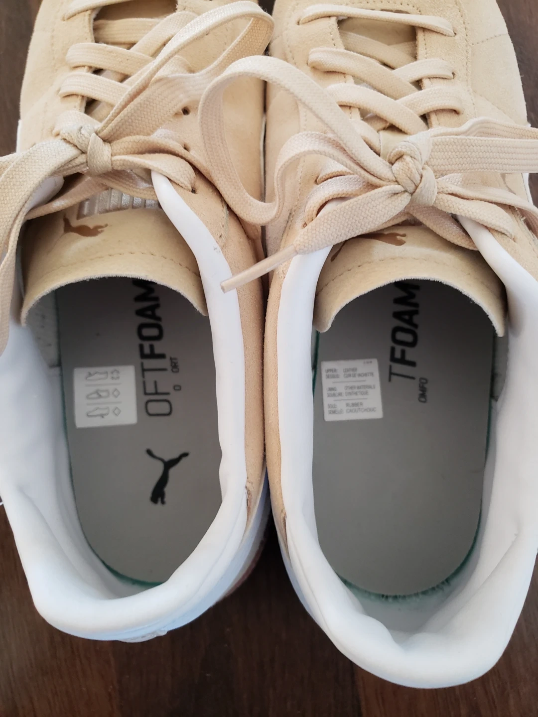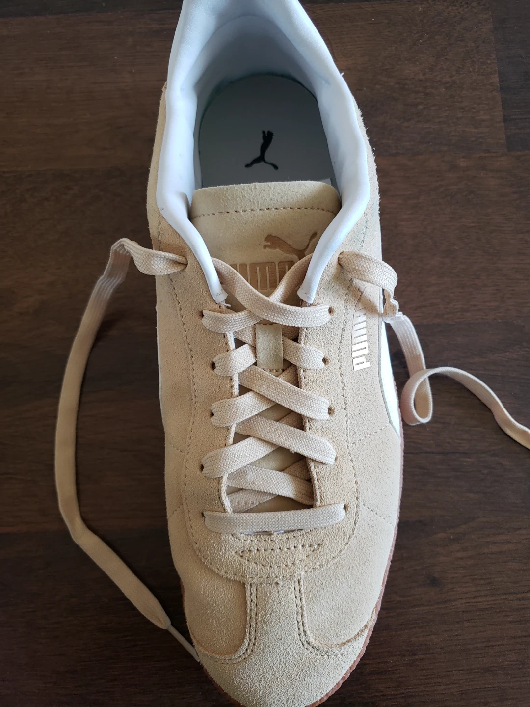 Cream-coloured sneakers. White accents on the sides and around the ankle. Tanned laces and a brown gum sole.