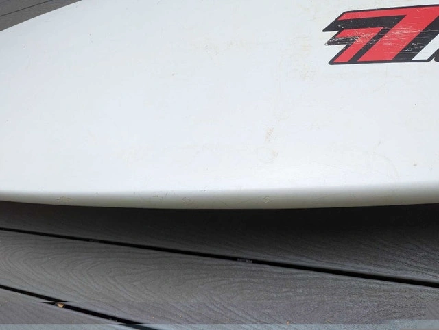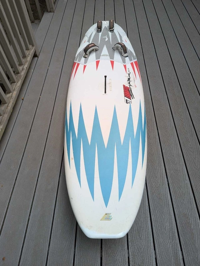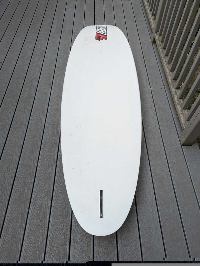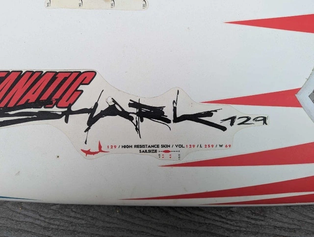 Fanatic Shark 129 liter widestyle board. Light, fast, and maneuverable. A few nicely repaired dings, some paint peeling along rails (cosmetic). Comes with choice of fin. Sail rig available separately if needed. September is often the best month for windsurfing with strong winds and warm temperatures.