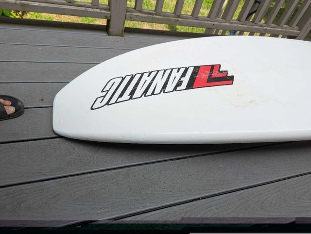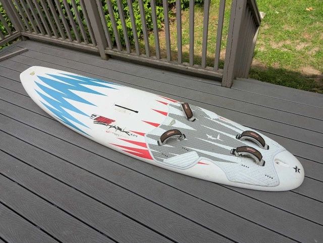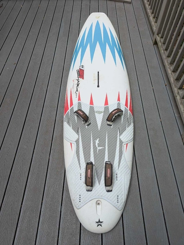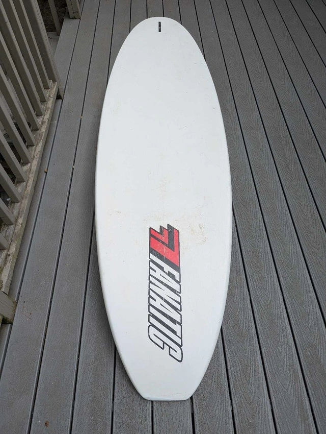 Fanatic Shark 129 liter widestyle board. Light, fast, and maneuverable. A few nicely repaired dings, some paint peeling along rails (cosmetic). Comes with choice of fin. Sail rig available separately if needed. September is often the best month for windsurfing with strong winds and warm temperatures.