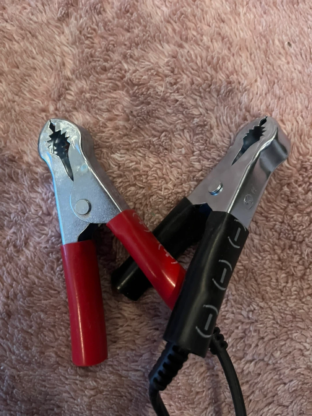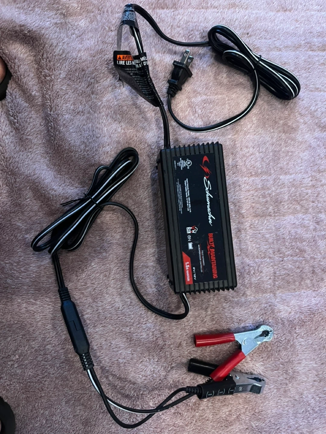 This is a Schumacher BCI 5A microprocessor-controlled battery charger. It's fully automatic and maintains 6V/12V batteries. Comes with a power cord and clamps.