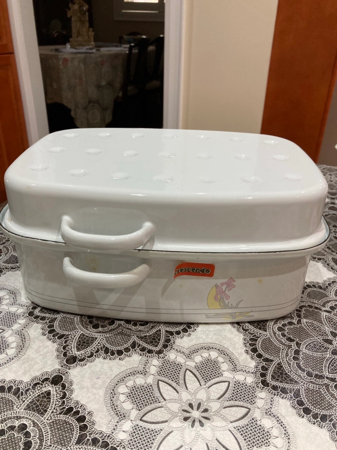White enamel double roaster. Features two compartments and handles. Floral design on the side. Excellent condition.