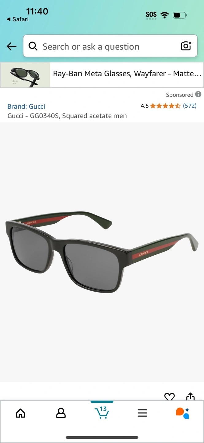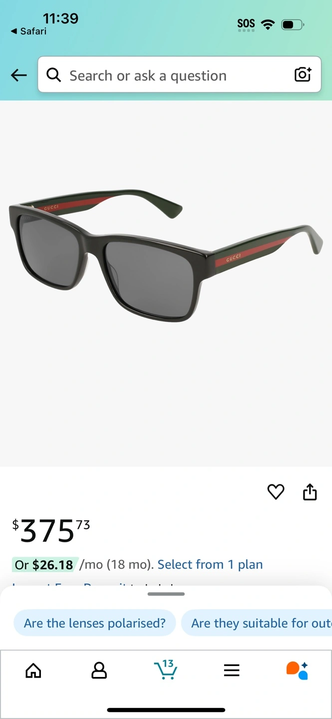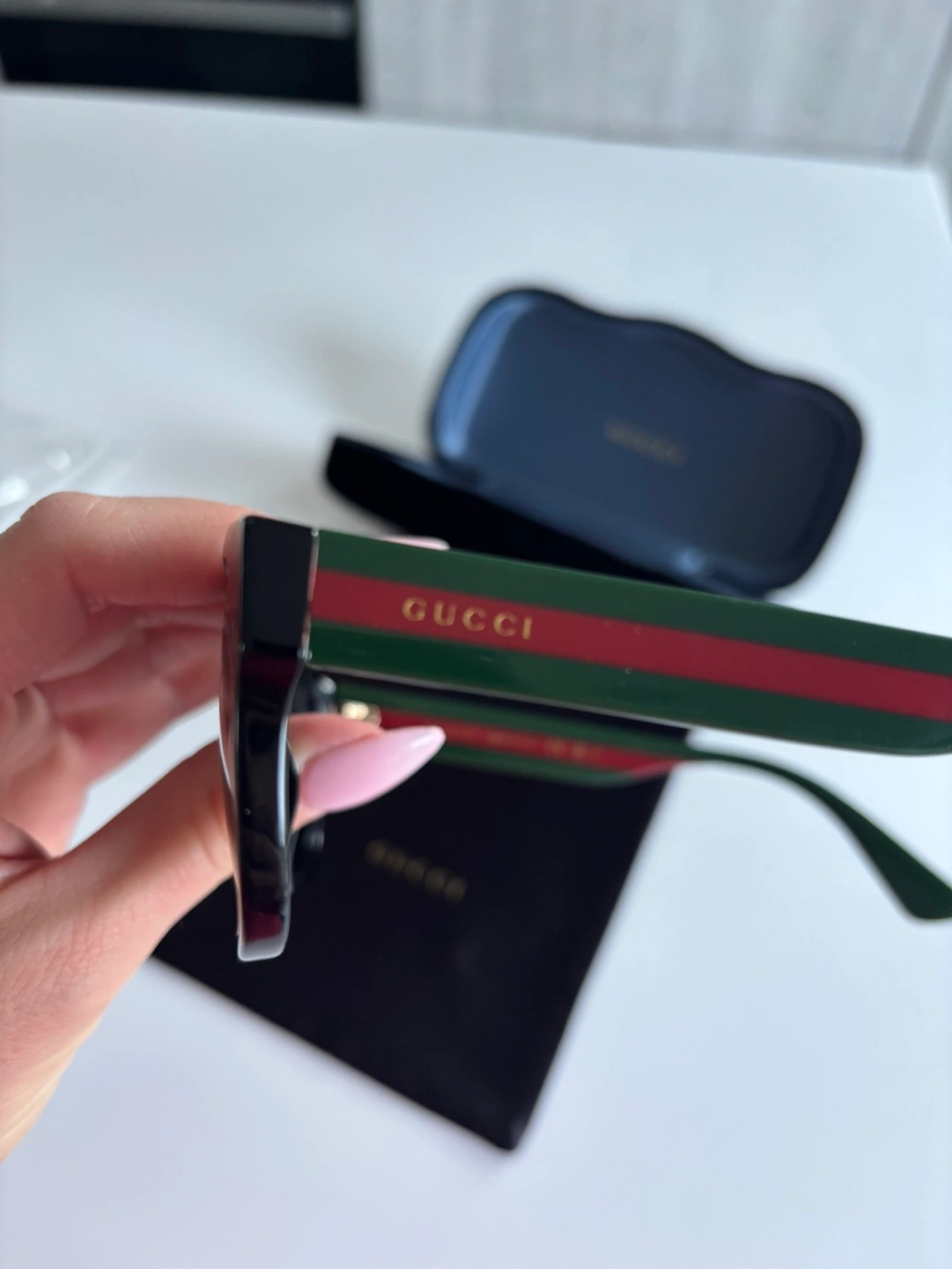 Authentic Gucci sunglasses. Black frame with green and red web stripe detail. Includes original case and cleaning cloth. Excellent condition.