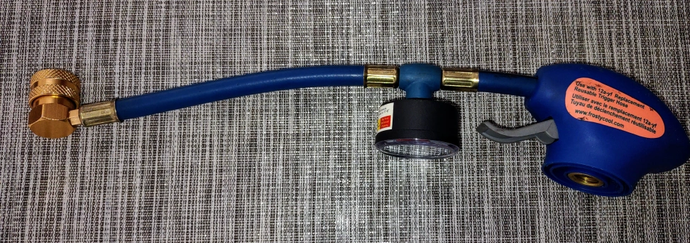 This FrostyCool 12a-yf replacement hose is designed for use with 12a-yf refrigerant systems, featuring a reusable trigger and integrated pressure gauge, ready to help you top up your car's AC. This is a used item.