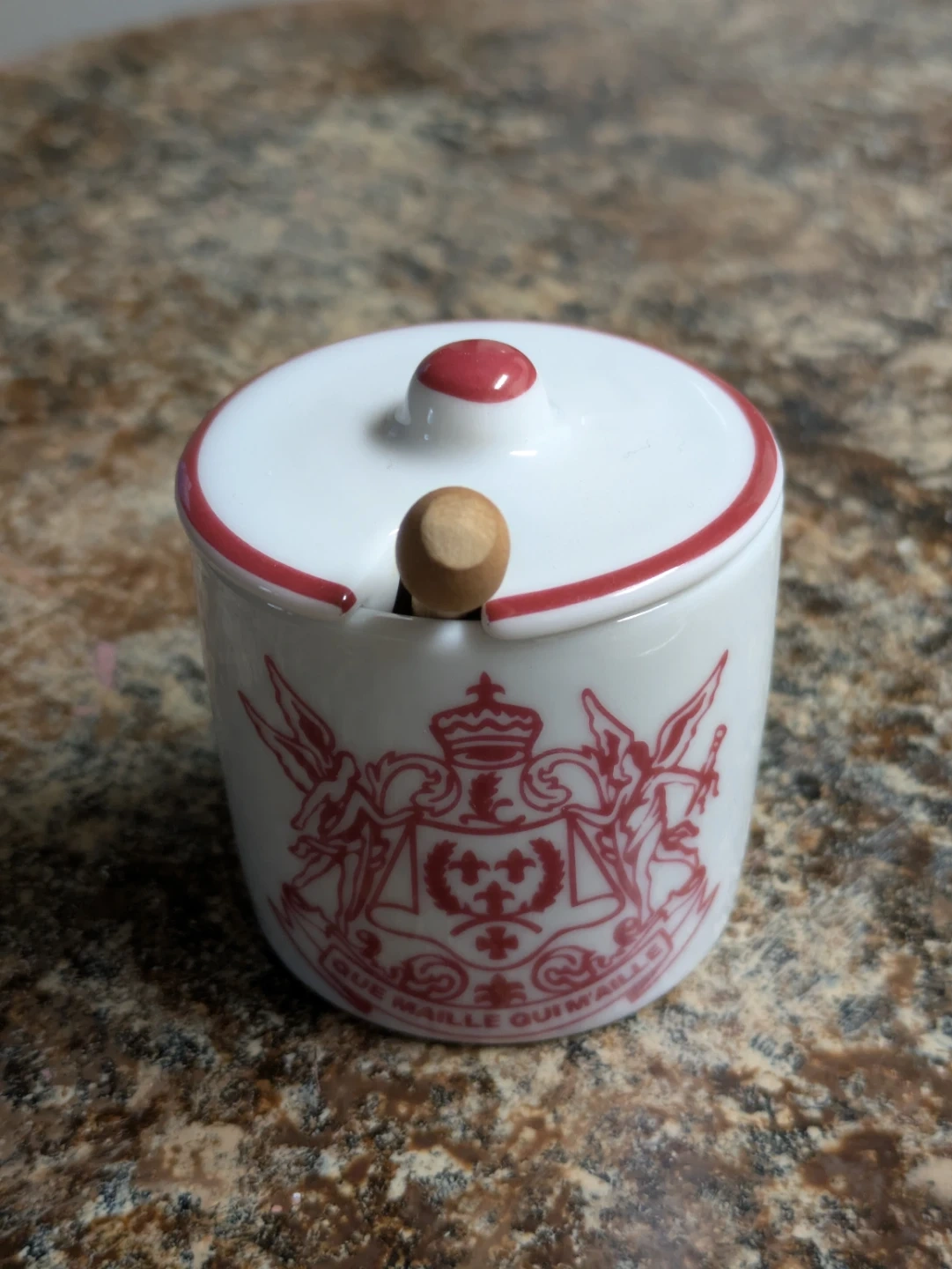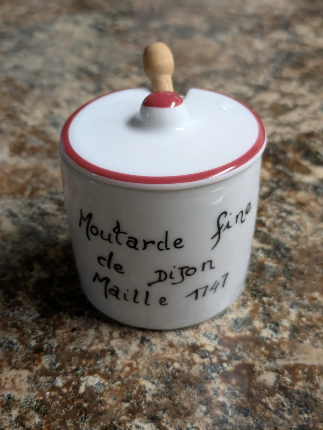 This is a vintage Maille mustard pot for Moutarde Fine de Dijon. It's made of ceramic and comes with a small wooden spoon. The pot features the Maille crest. Perfect for serving mustard at the table!