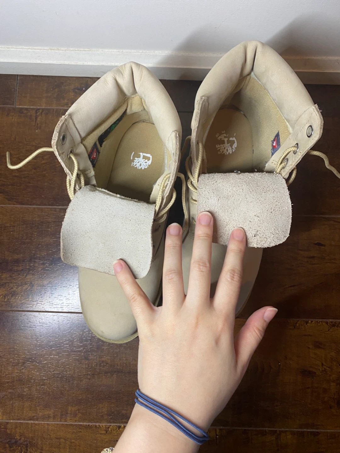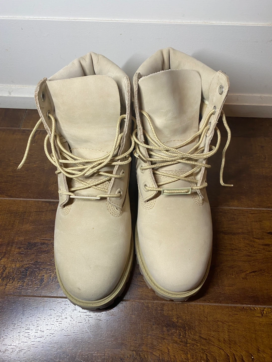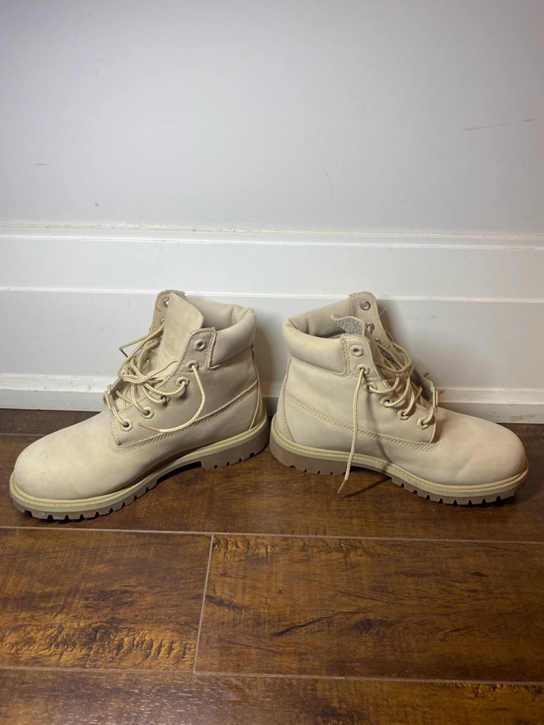 Classic Timberland 6-inch waterproof boots in a medium beige nubuck colour. Junior size 5. These boots are built to last and offer great protection for all-weather wear. Durable construction with a comfortable fit.
