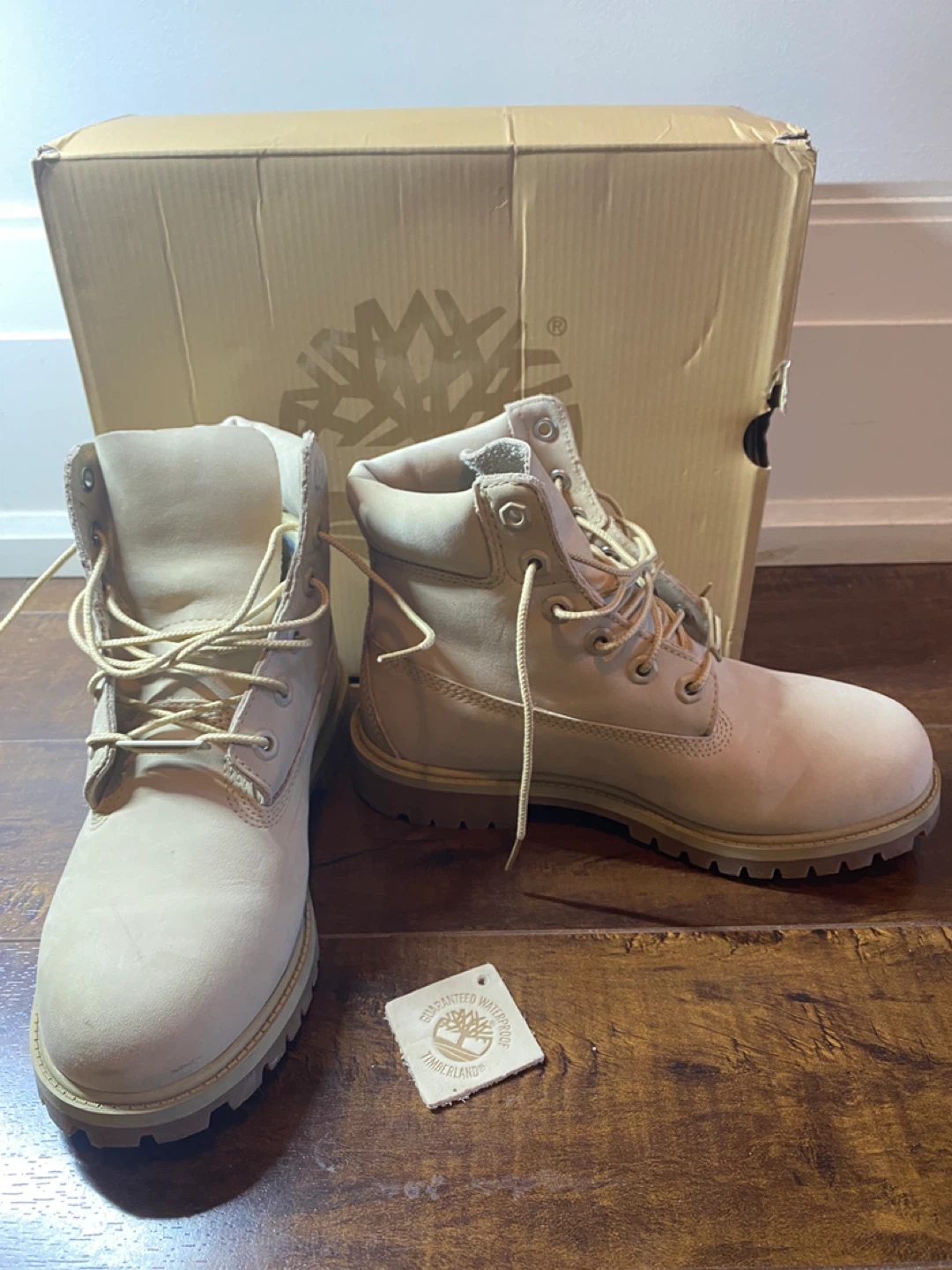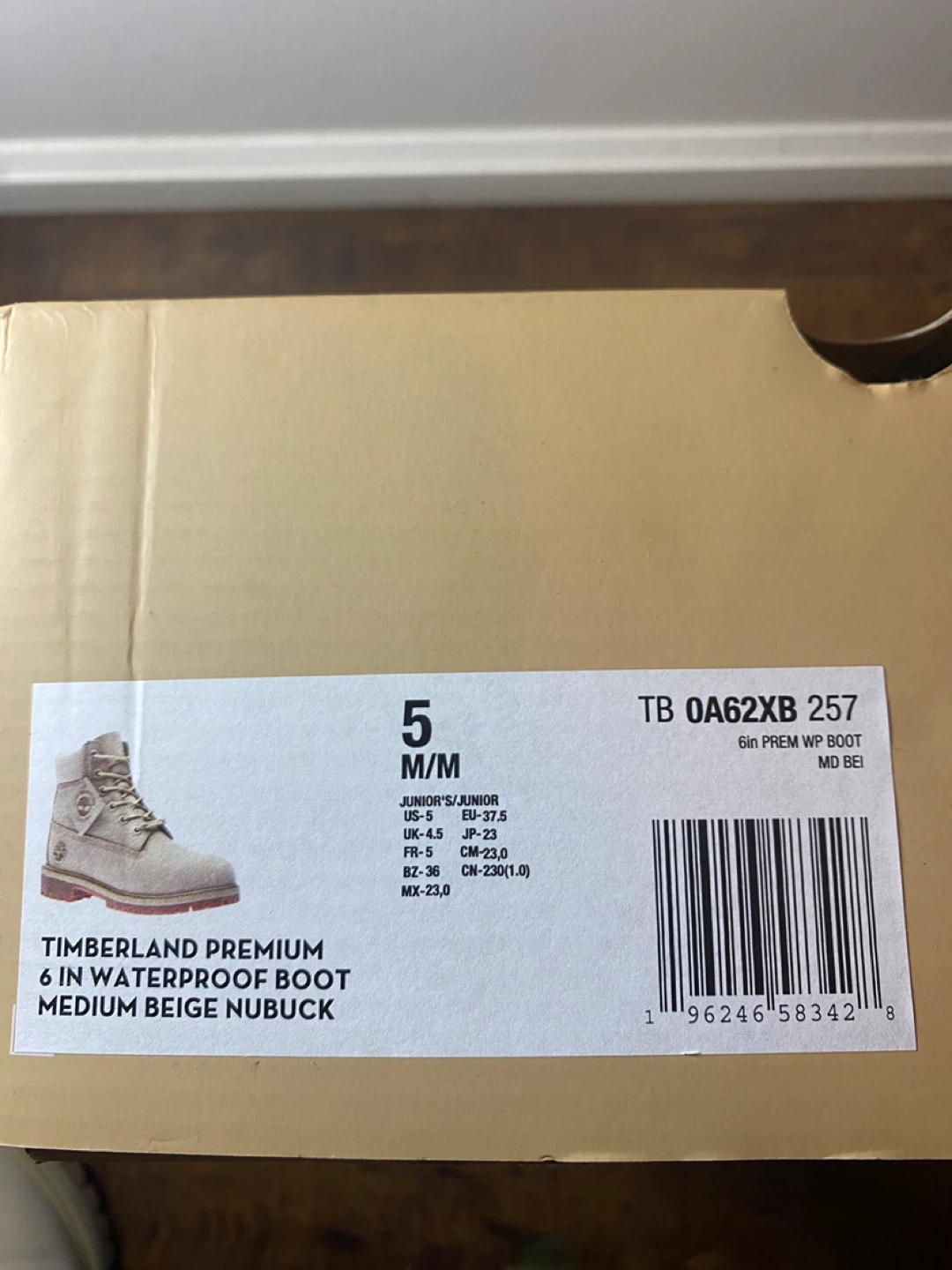 Classic Timberland 6-inch waterproof boots in a medium beige nubuck colour. Junior size 5. These boots are built to last and offer great protection for all-weather wear. Durable construction with a comfortable fit.