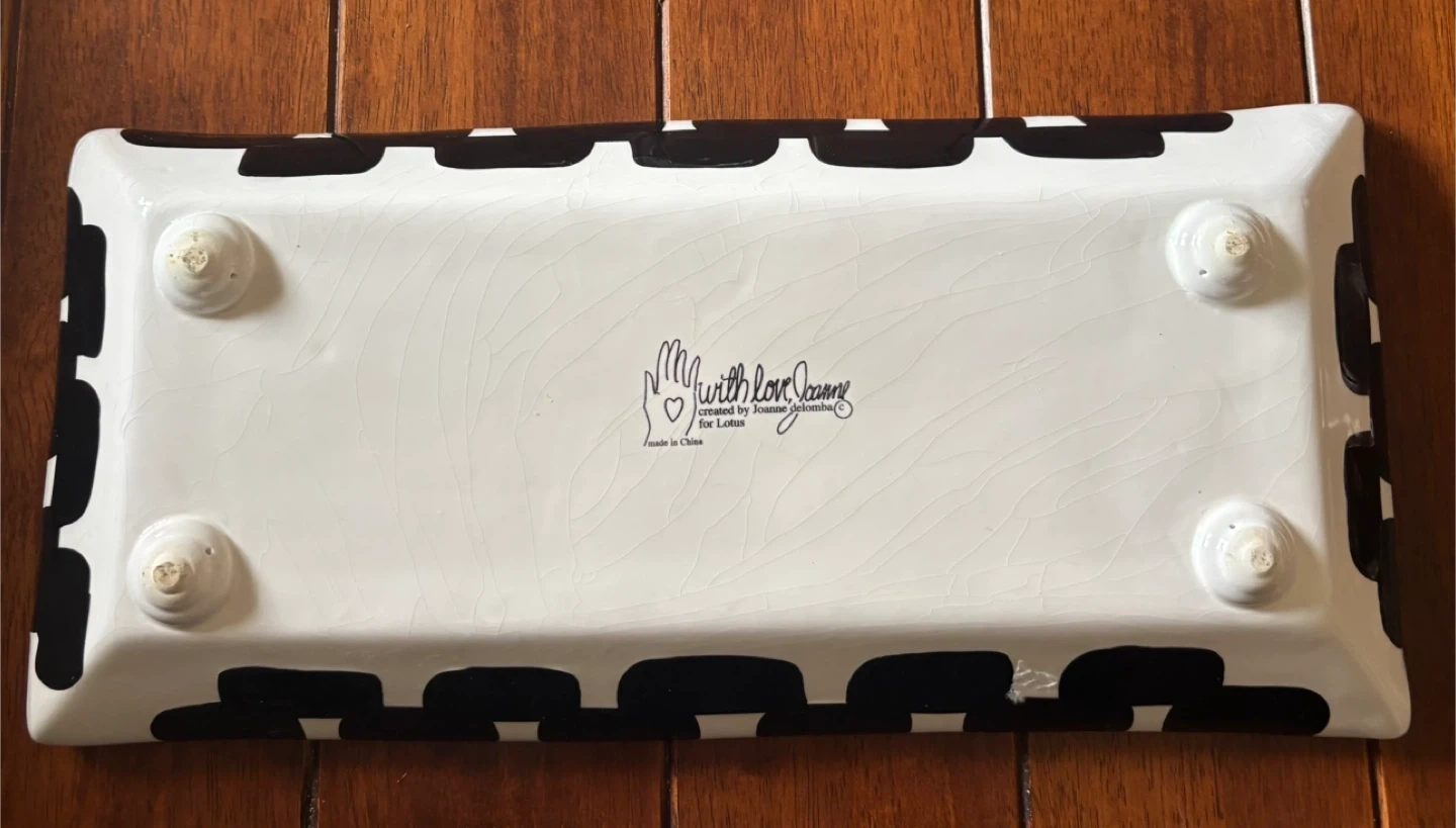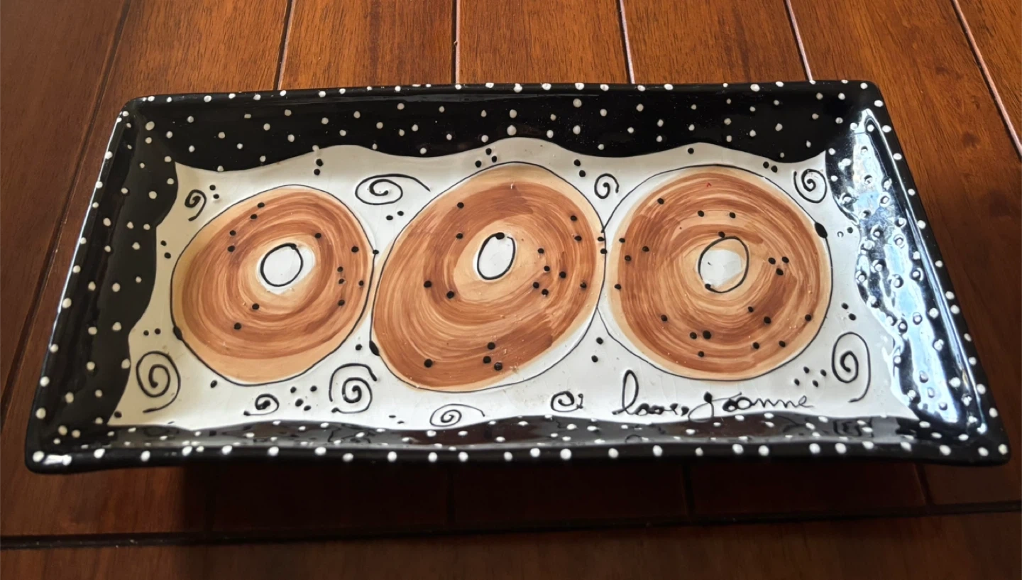 This decorative ceramic tray features a hand-painted design of three bagels with black speckles and a black polka dot border. It's marked 'with love Suzanne'. This unique piece is great for serving snacks or as a centrepiece!
