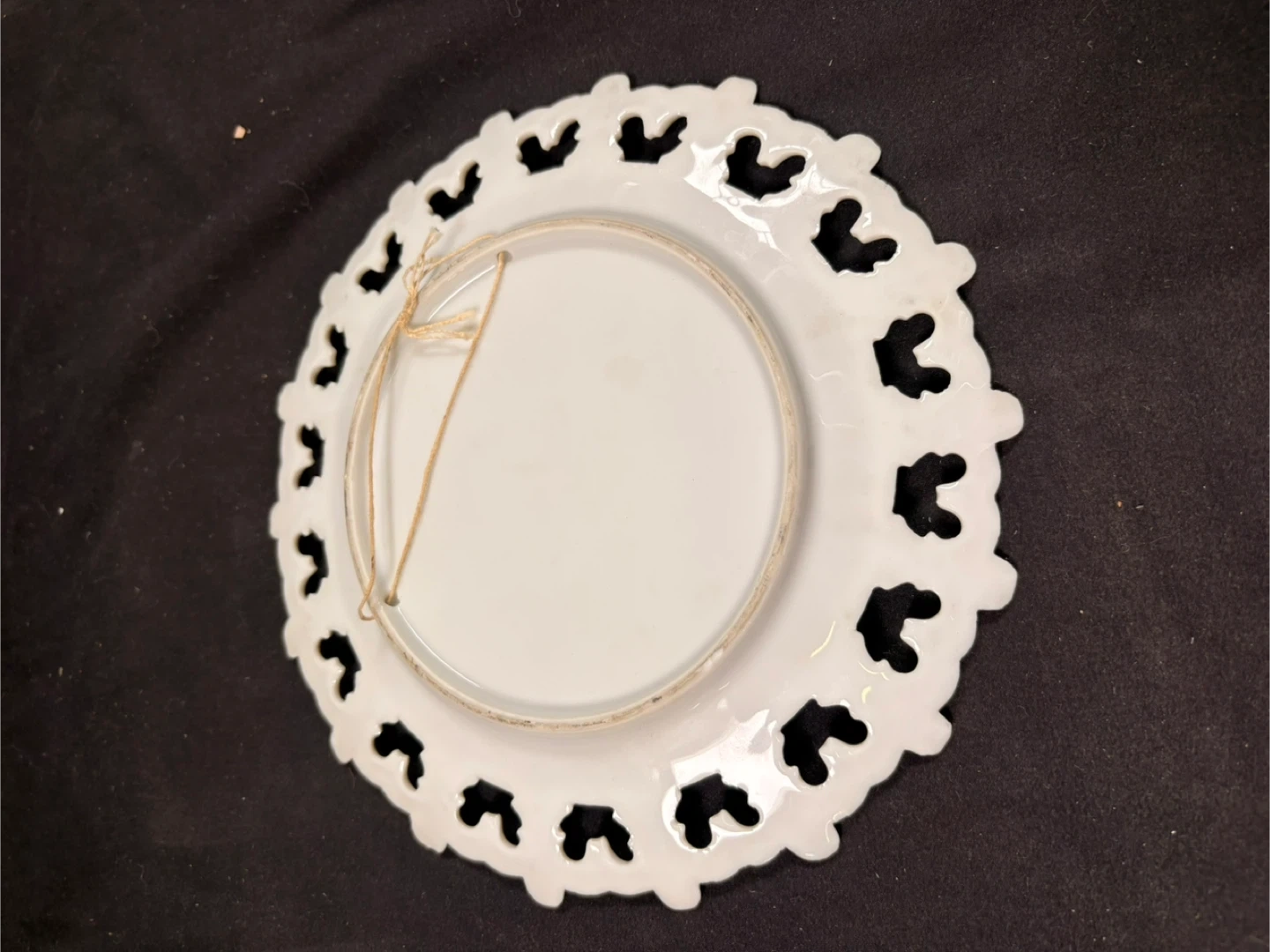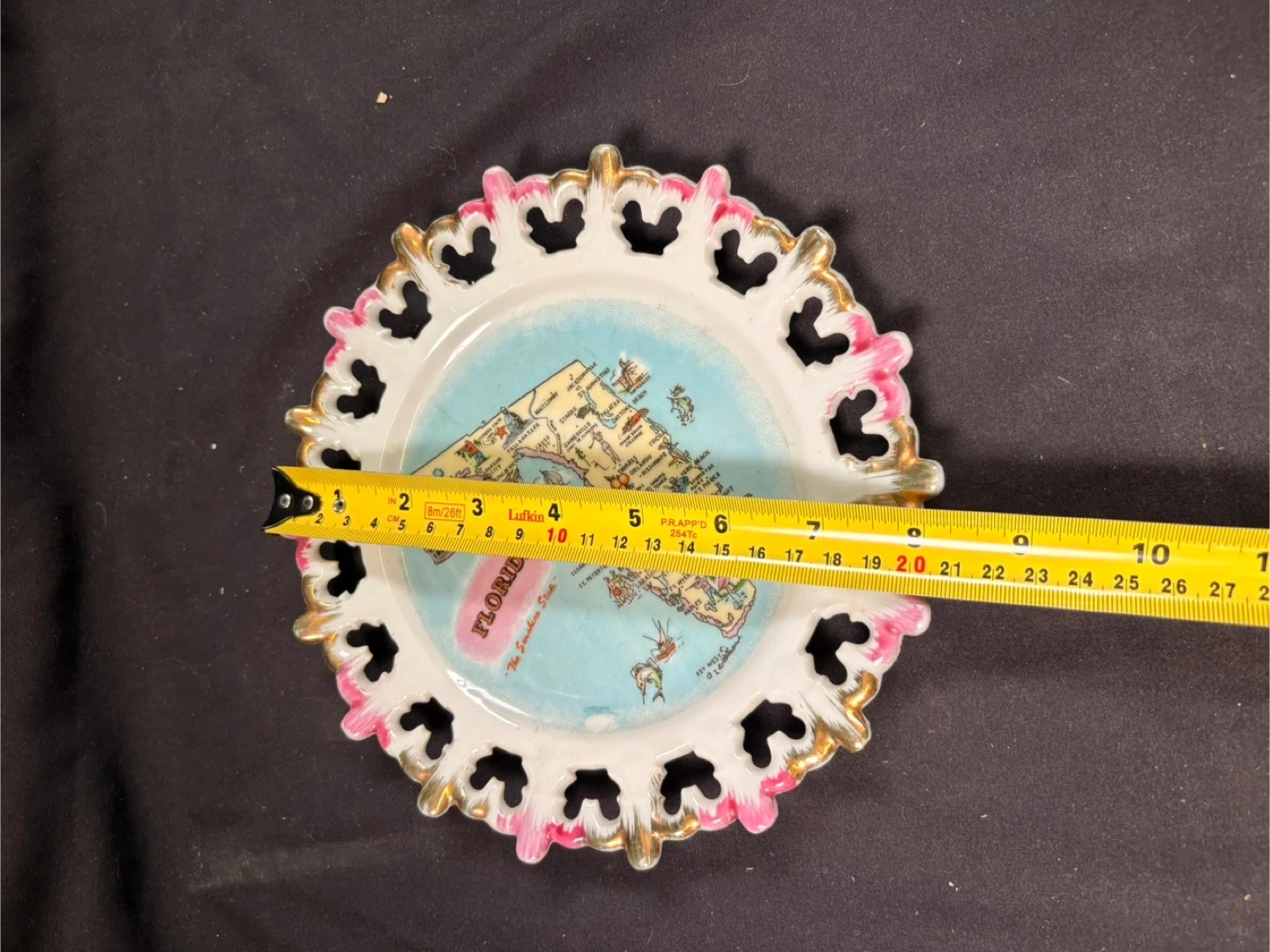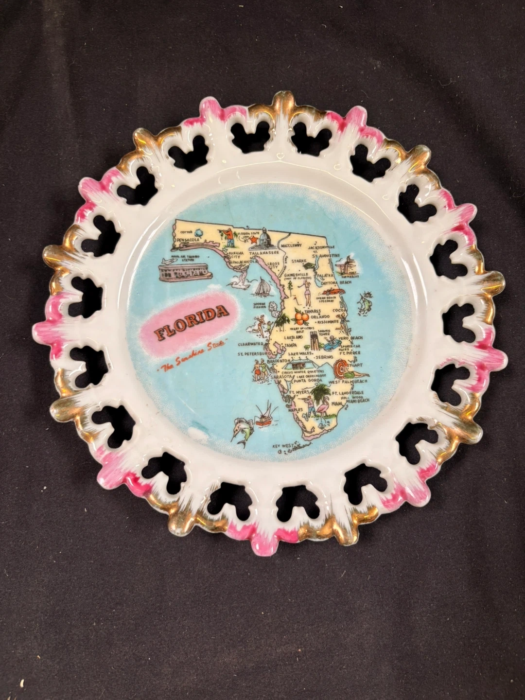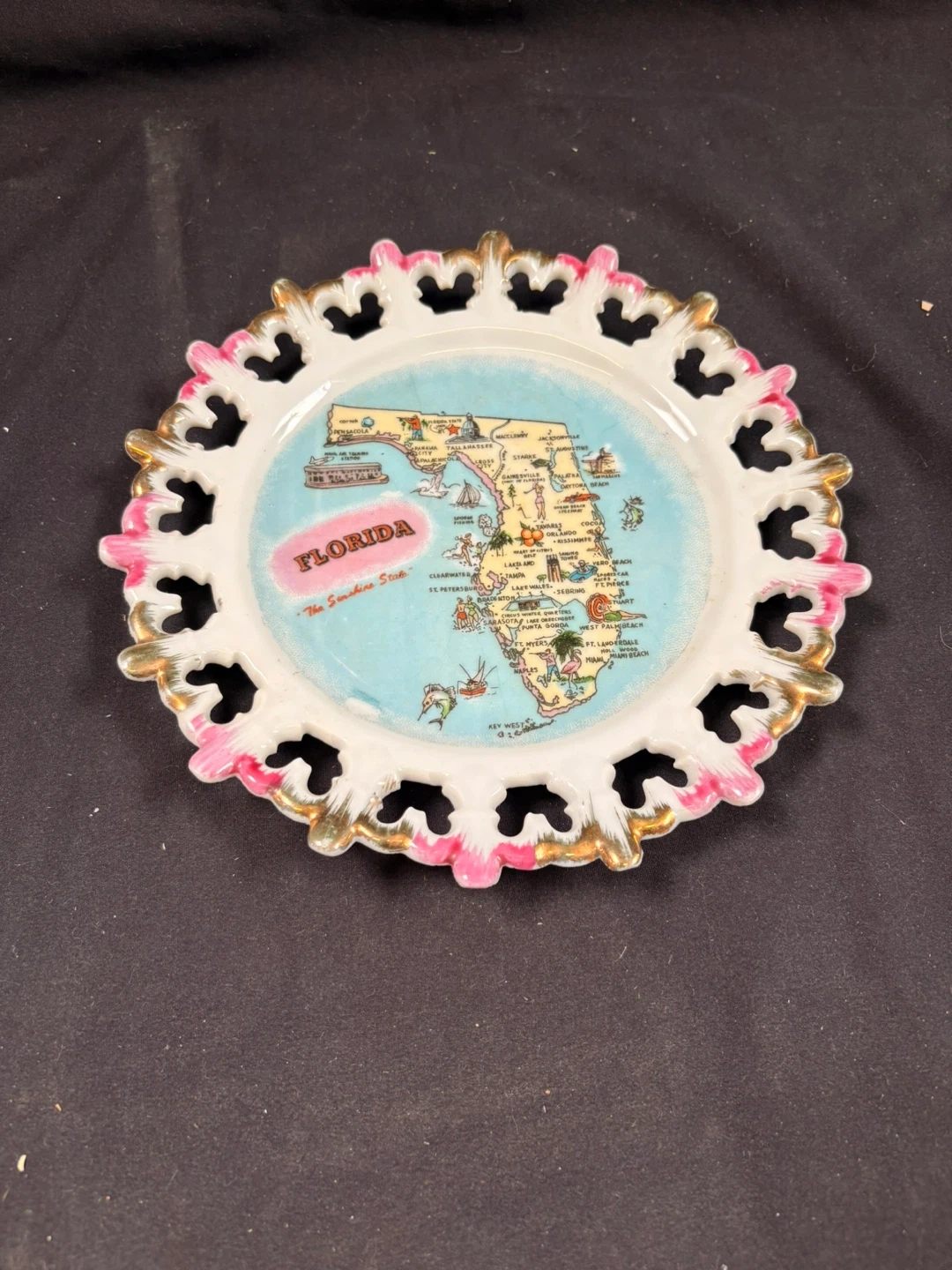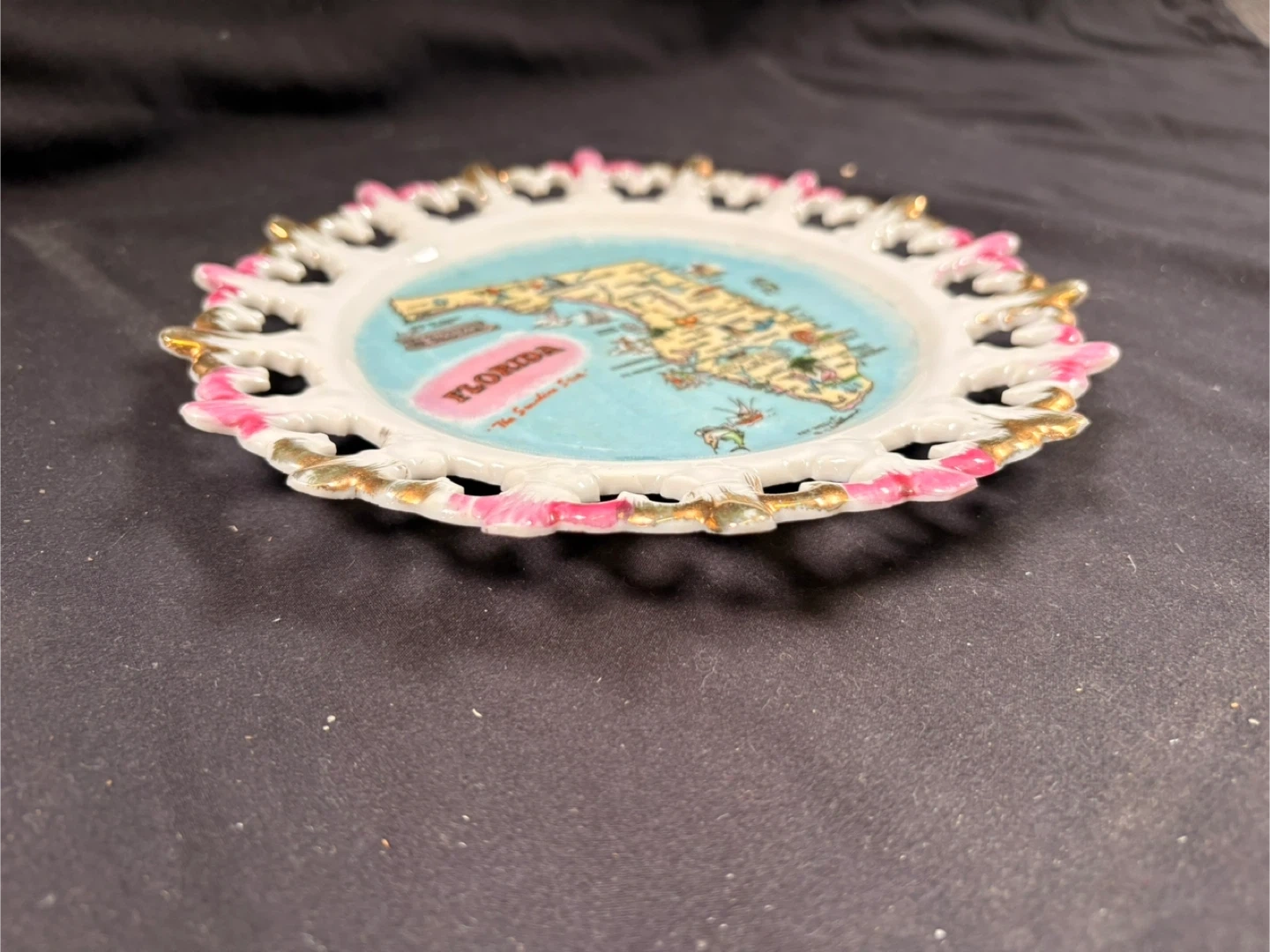 This is a decorative porcelain plate featuring a colourful map of Florida and its attractions. It has a scalloped edge with pink and gold trim. Measures about 6 inches in diameter.