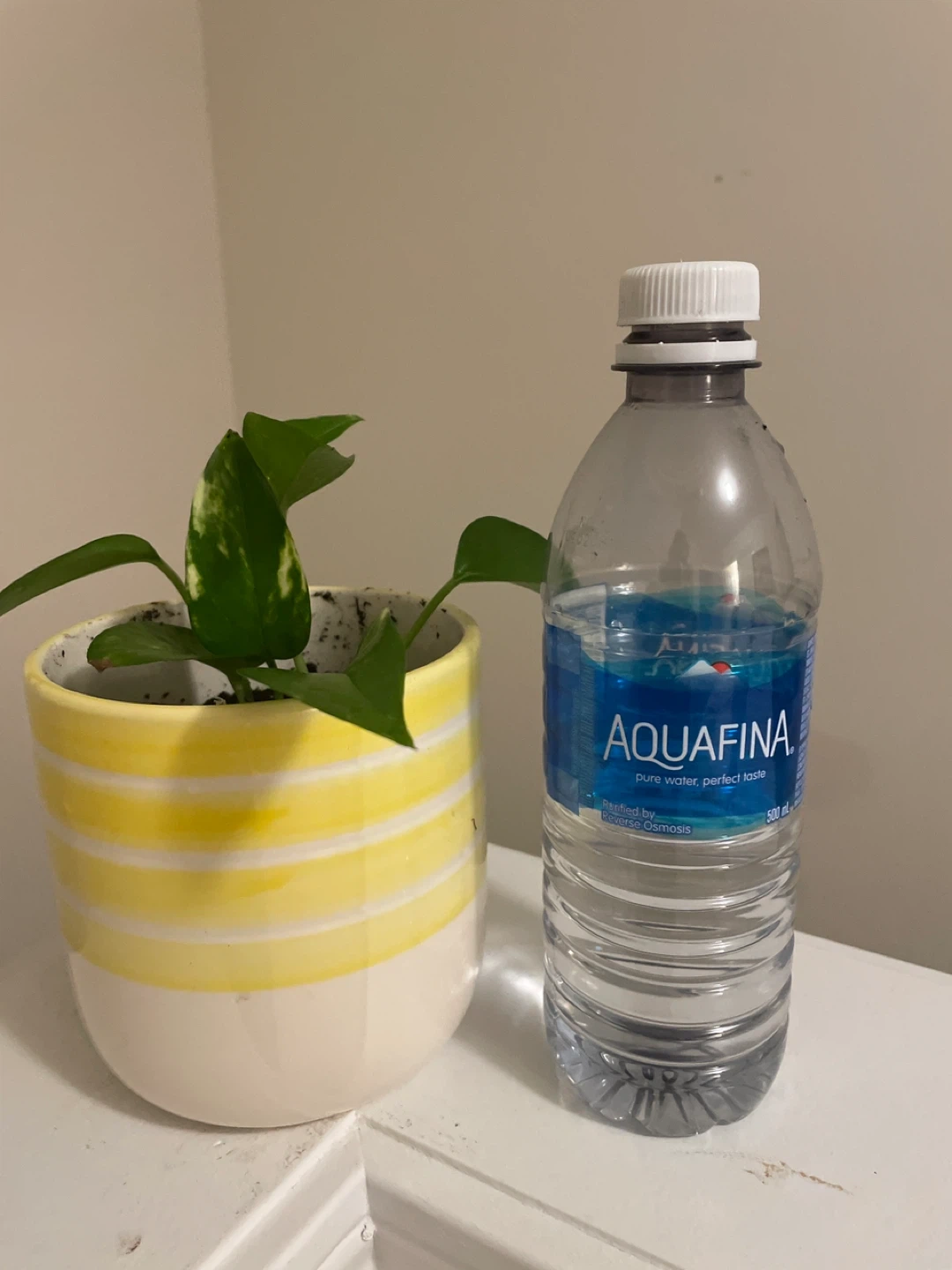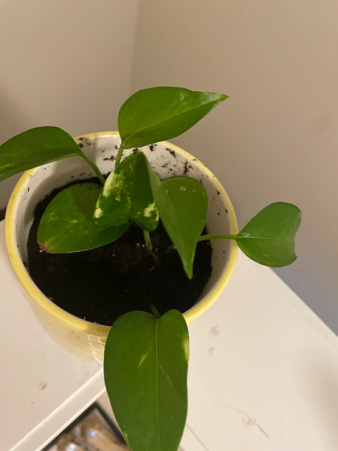 A healthy Pothos plant in a charming yellow and white striped ceramic pot. It's a vining plant with variegated green leaves. Pot is approximately 6 inches tall. Easy to care for and great for adding some greenery to your space!
