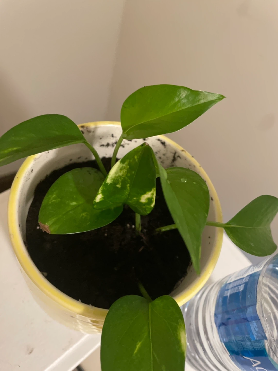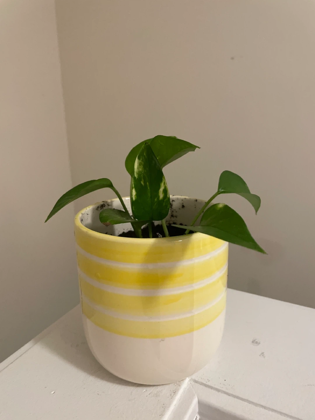 A healthy Pothos plant in a charming yellow and white striped ceramic pot. It's a vining plant with variegated green leaves. Pot is approximately 6 inches tall. Easy to care for and great for adding some greenery to your space!