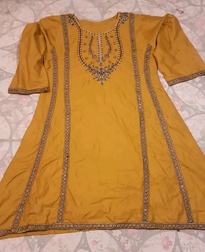 Selling a mustard yellow kurti with beautiful embroidery. It's in great condition and ready for a new home!