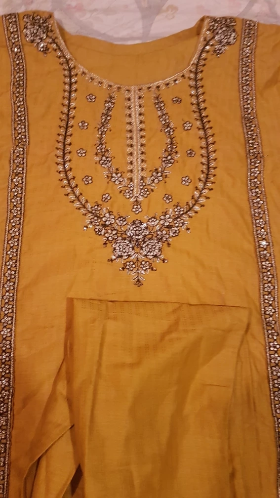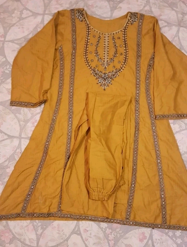 Selling a mustard yellow kurti with beautiful embroidery. It's in great condition and ready for a new home!