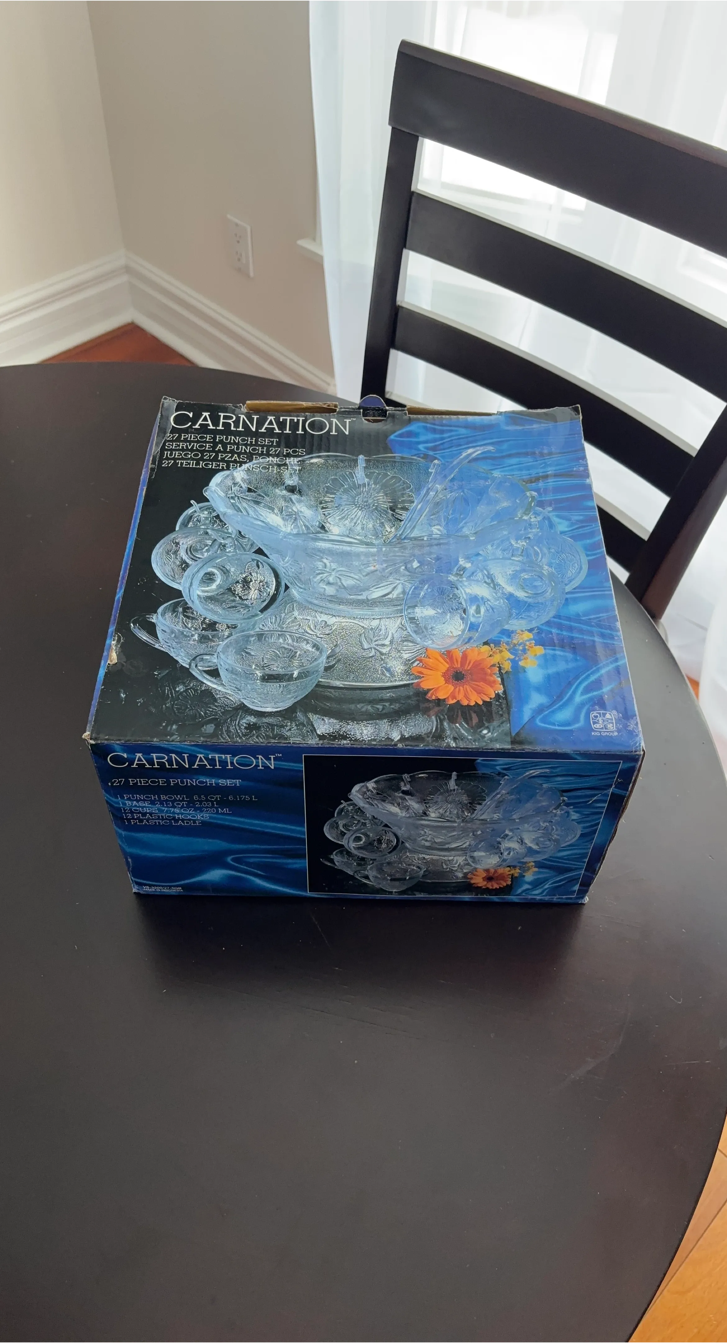 This Carnation 27-piece punch set includes a punch bowl, base, 12 cups, 12 plastic hooks, and a plastic ladle. The punch bowl is 6.5 quarts and the base is 2.13 quarts. Cups are 7.75 ounces each. It's great for serving beverages at gatherings!
