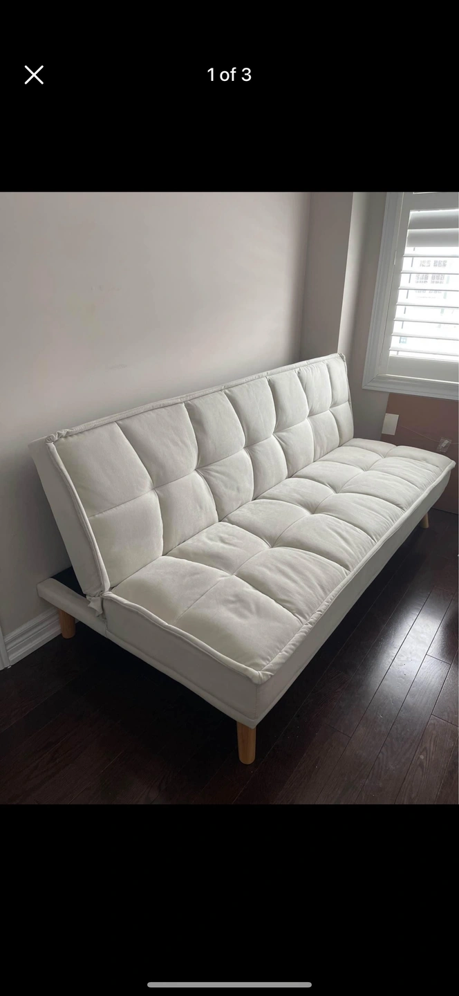 Futon folds down to a bed. When upright, it can recline to two different levels. It is in good condition. Ready to be picked up and must be gone by Sunday as I have nowhere to store it.