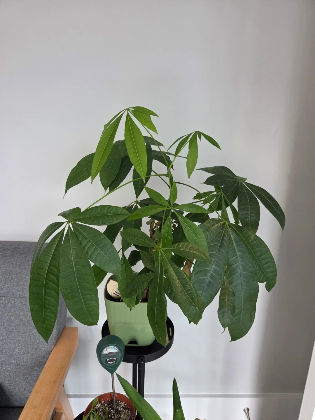 Healthy money tree plant in a light green pot. It's a good size for indoor decor.