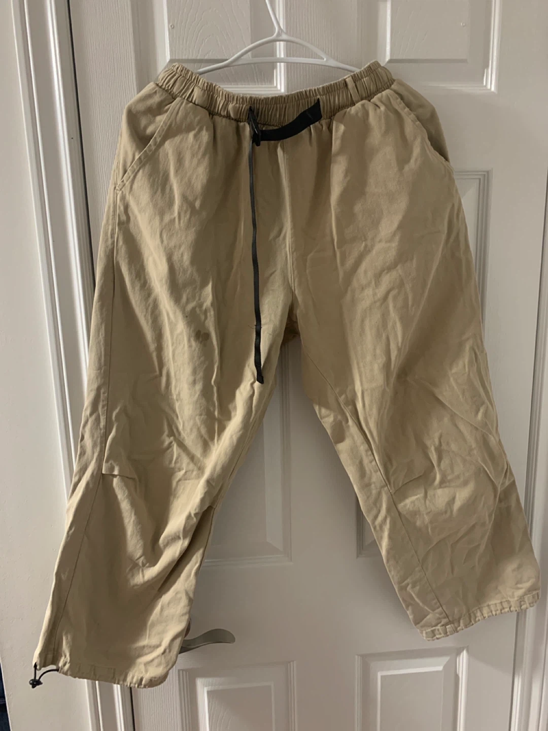 Selling a pair of beige cropped pants. They're in good condition and have a comfortable elastic waistband with a drawstring. Perfect for casual wear!
