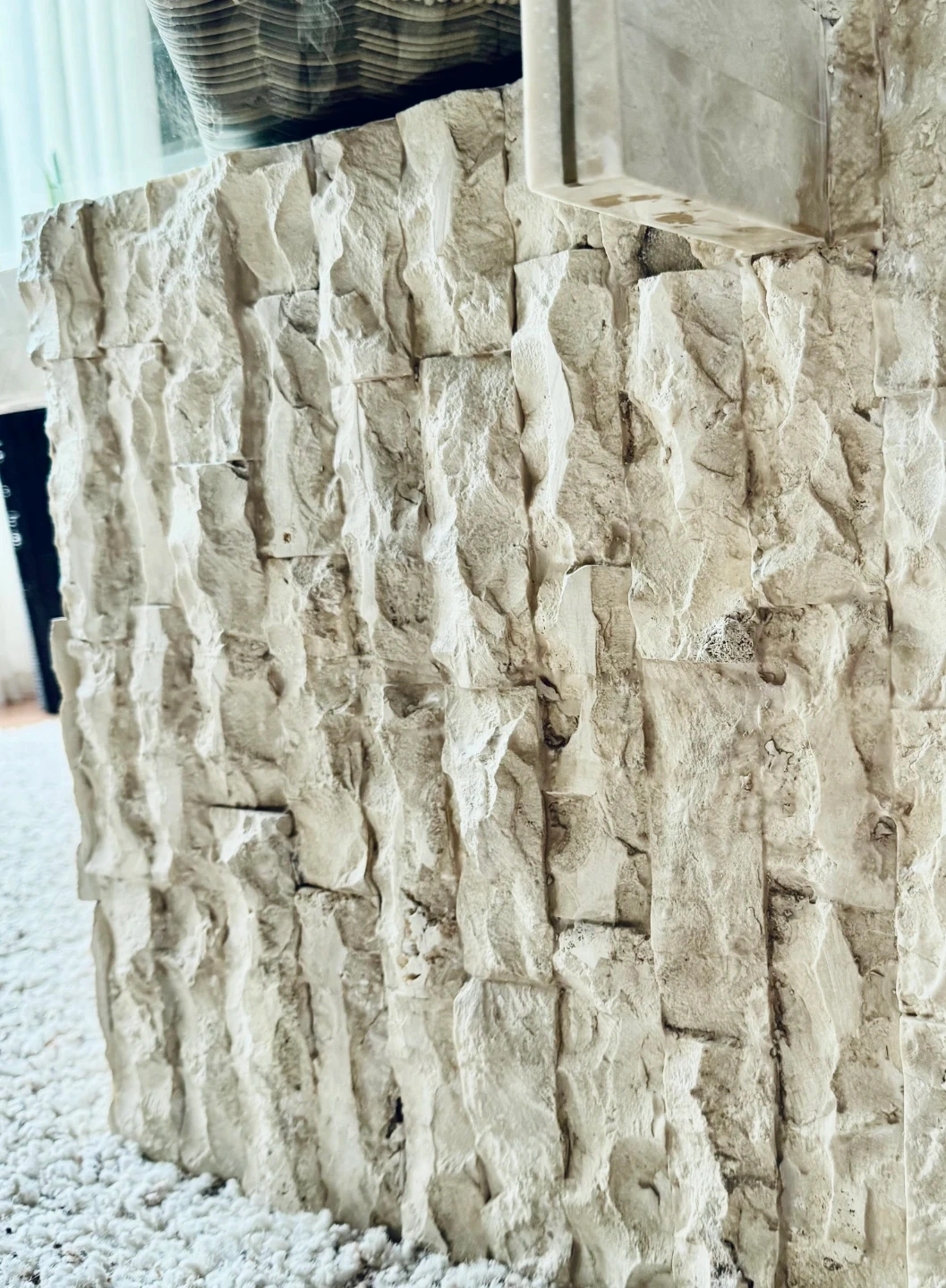 This coffee table features a clear glass top with a unique stone fossil base. It's a striking accent piece for your living room. The base is made of stacked stone pieces with a textured finish.