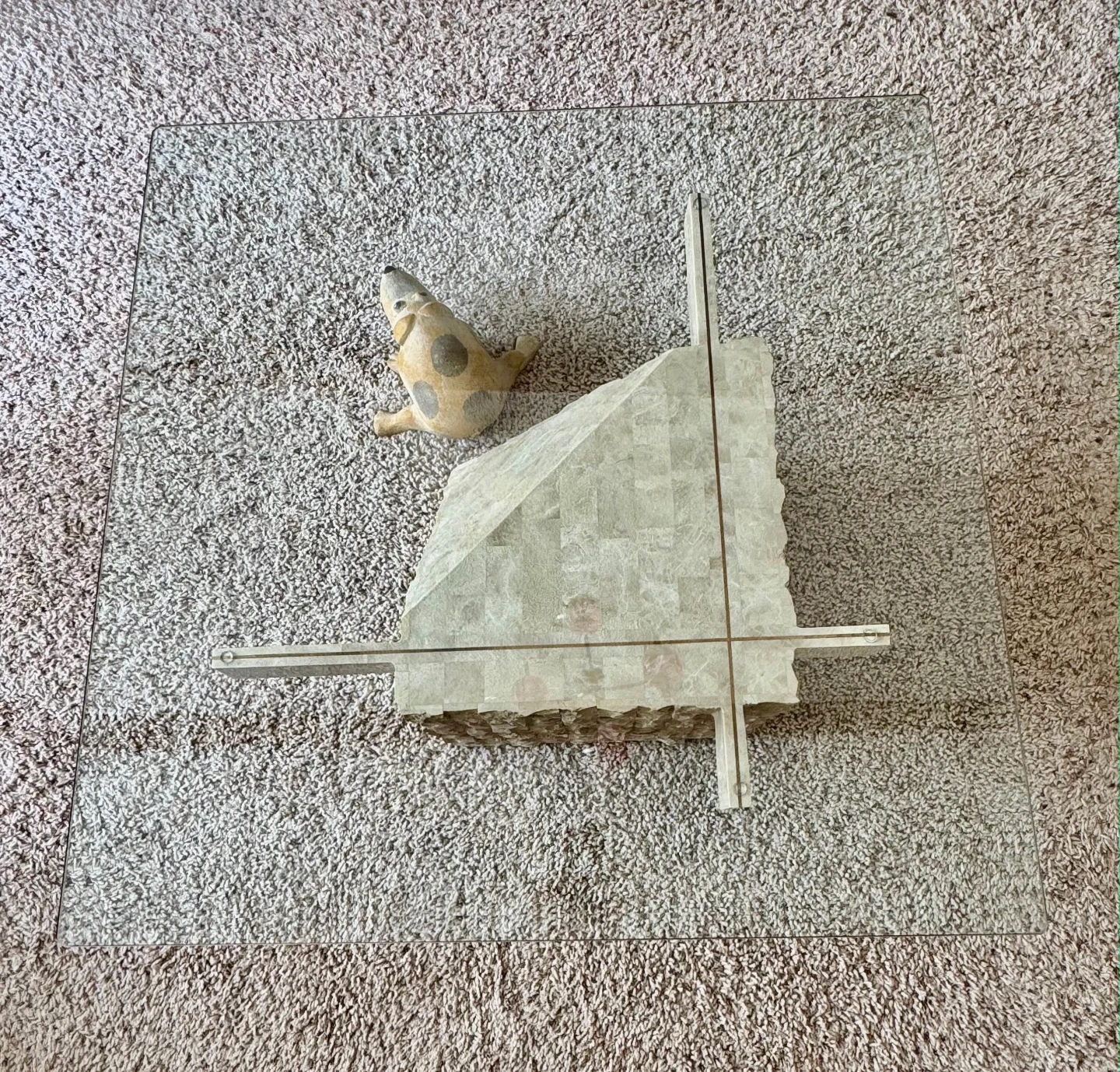 This coffee table features a clear glass top with a unique stone fossil base. It's a striking accent piece for your living room. The base is made of stacked stone pieces with a textured finish.