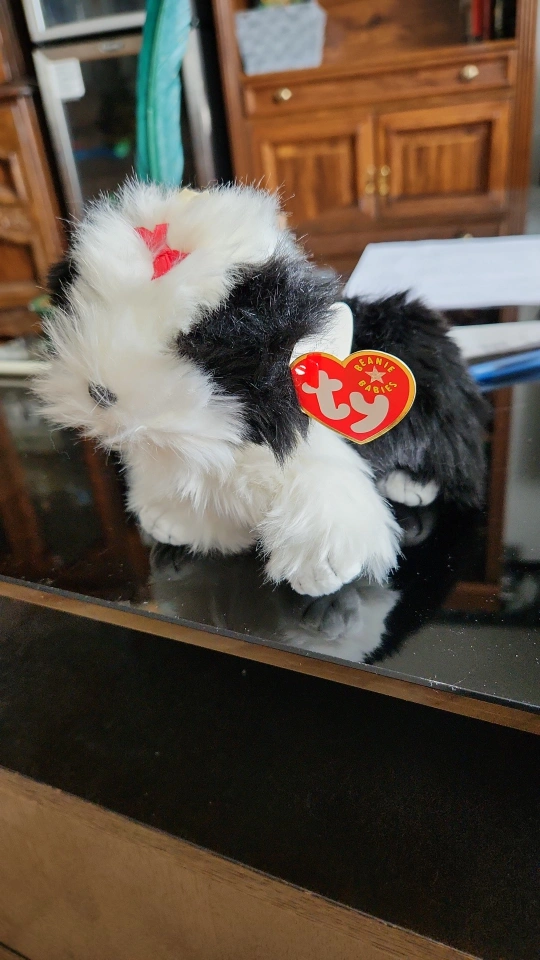 Adorable black and white puppy Beanie Baby. Features a red bow. Collectible item.