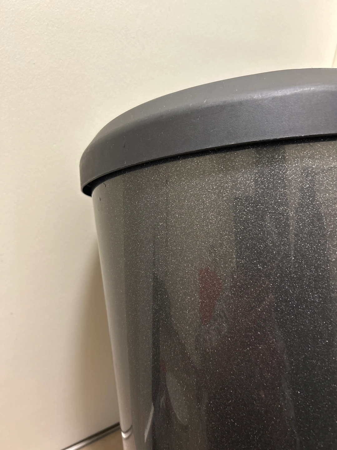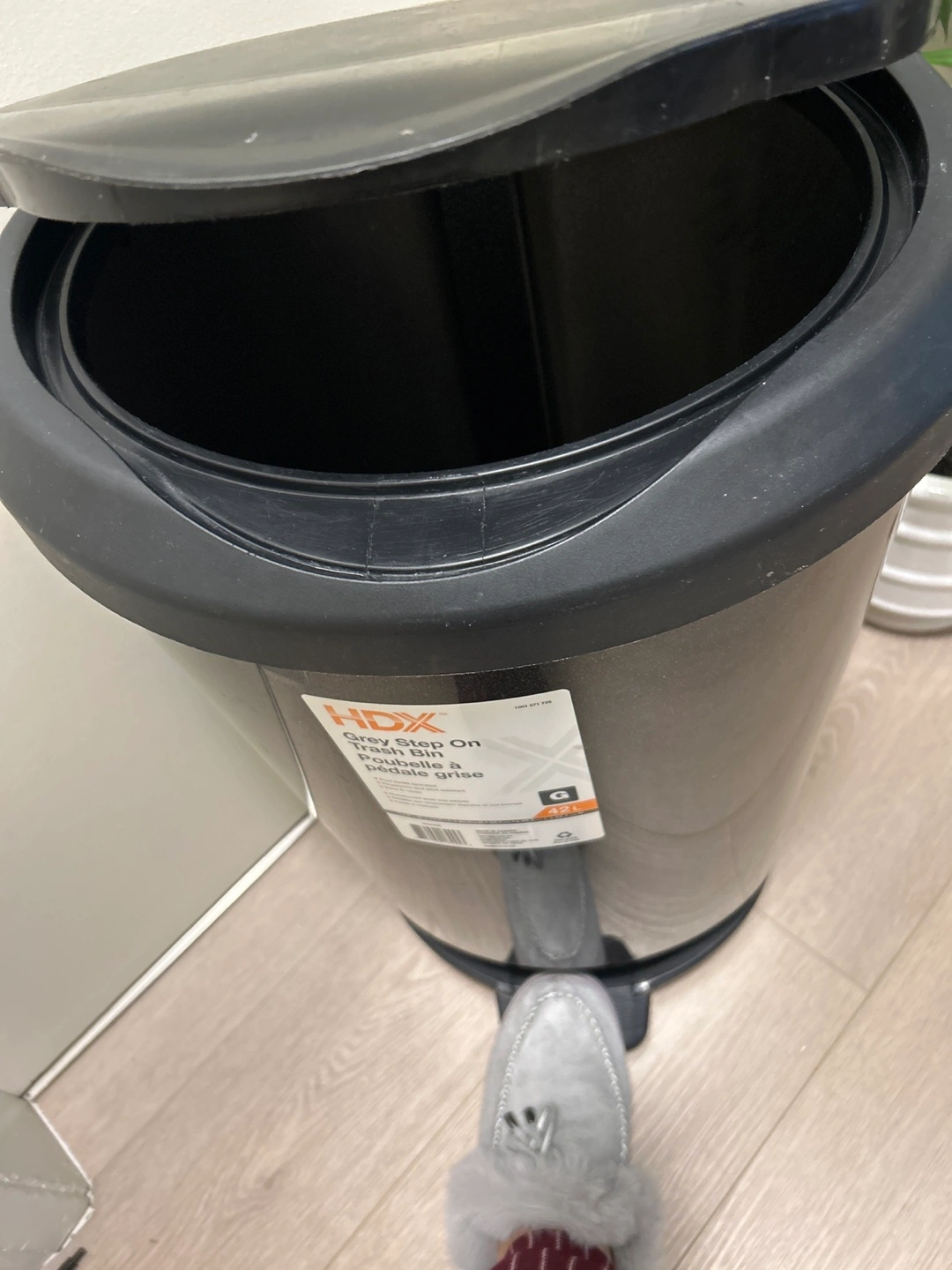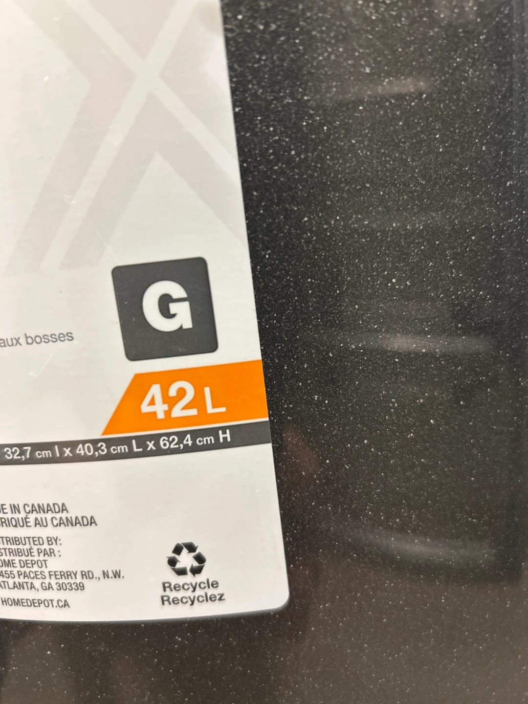 This is an HDX 42L step-on trash bin in a grey speckled finish. It features a foot pedal for hands-free operation. The bin measures 32.7 cm L x 40.3 cm W x 62.4 cm H.