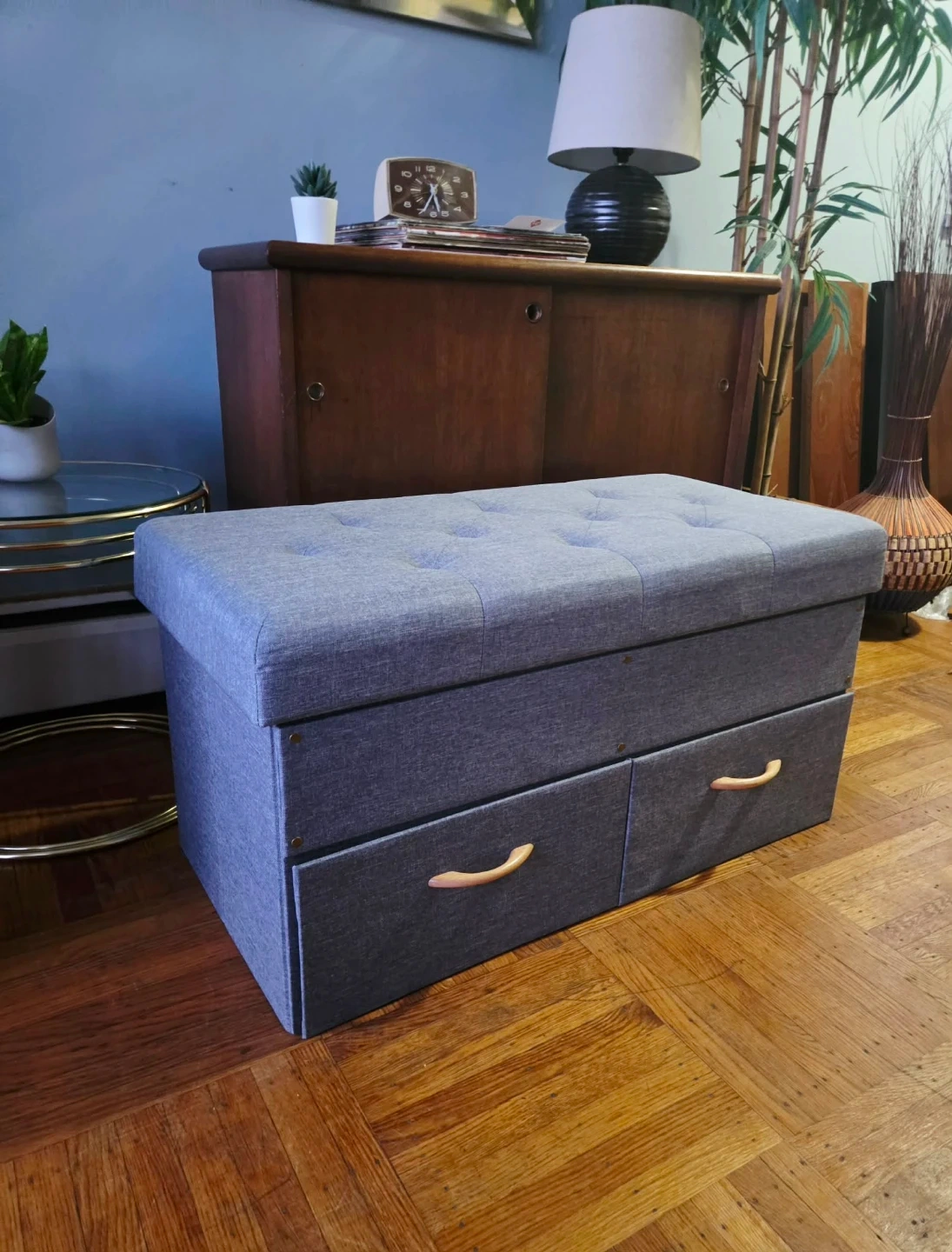 Grey tufted fabric storage bench with two drawer in flawless condition.