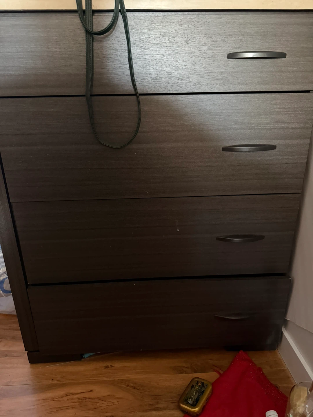 This is a dark brown dresser with four drawers. The finish is a wood grain laminate. It's a sturdy piece of furniture that provides ample storage space.